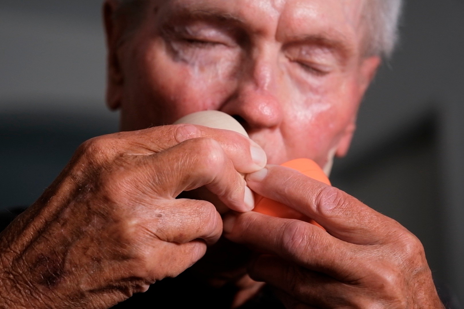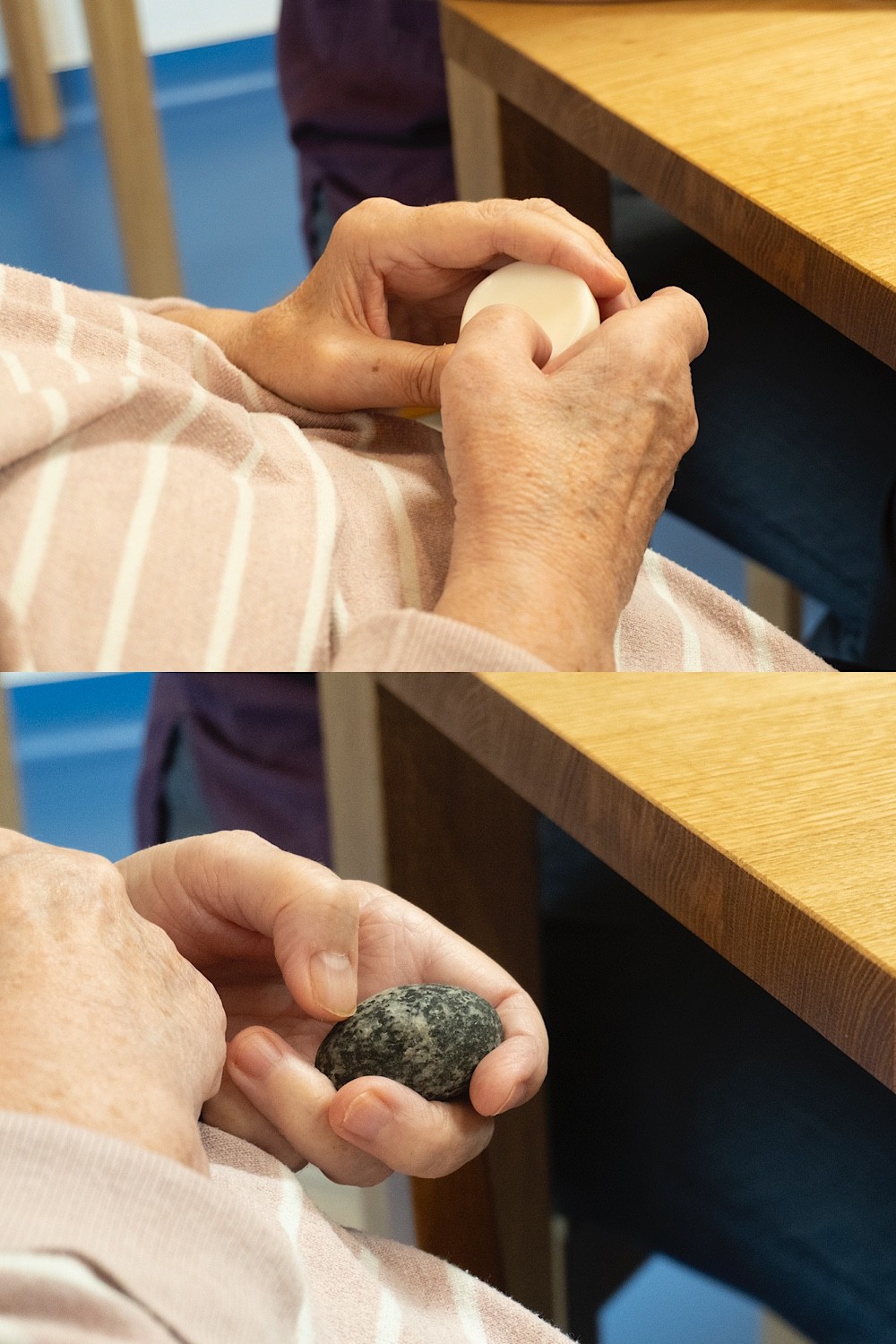 Es war wichtig, erst mal ohne Verantwortung da zu sein. Zum Wahrnehmen, Notieren, Nachfragen. Dann brauchte es viel Flexibilität. Wer ist wann wach, fit und gut gelaunt? Ich war froh um die Unterstützung der Stationsleiterin, ihre Offenheit und Interesse. Wir setzten uns in den Gemeinschaftsbereich, wo es viel Aktivität gibt. Fragten, wer sich dazu setzen möchte. Ich hatte Duftkarten und Objekte dabei, aus Stein, Wachs oder Ton. Mit verschiedenen Farben, Mustern und Texturen. Und Gerüche natürlich. Ich wollte herausfinden, wie klar oder abstrakt die Stimuli sein müssen, um zur Interaktion einzuladen. Das brauchte viel Zeit, aber es war sehr spannend ins Gespräch zu kommen, etwas anzubieten und herauszufinden, was passiert. Manche Gegenstände blieben lange in den Händen, andere wurden schnell zurückgelegt.