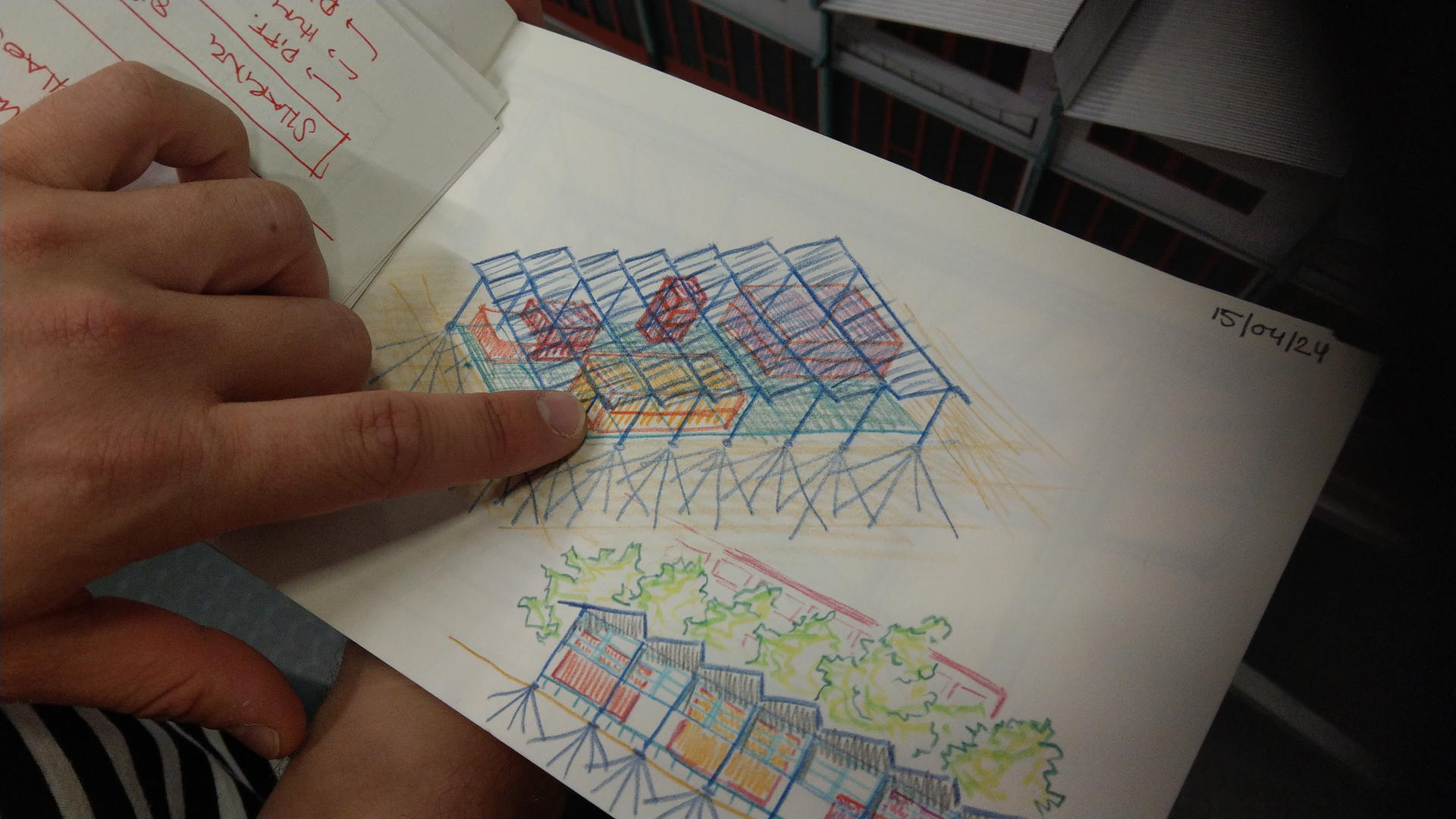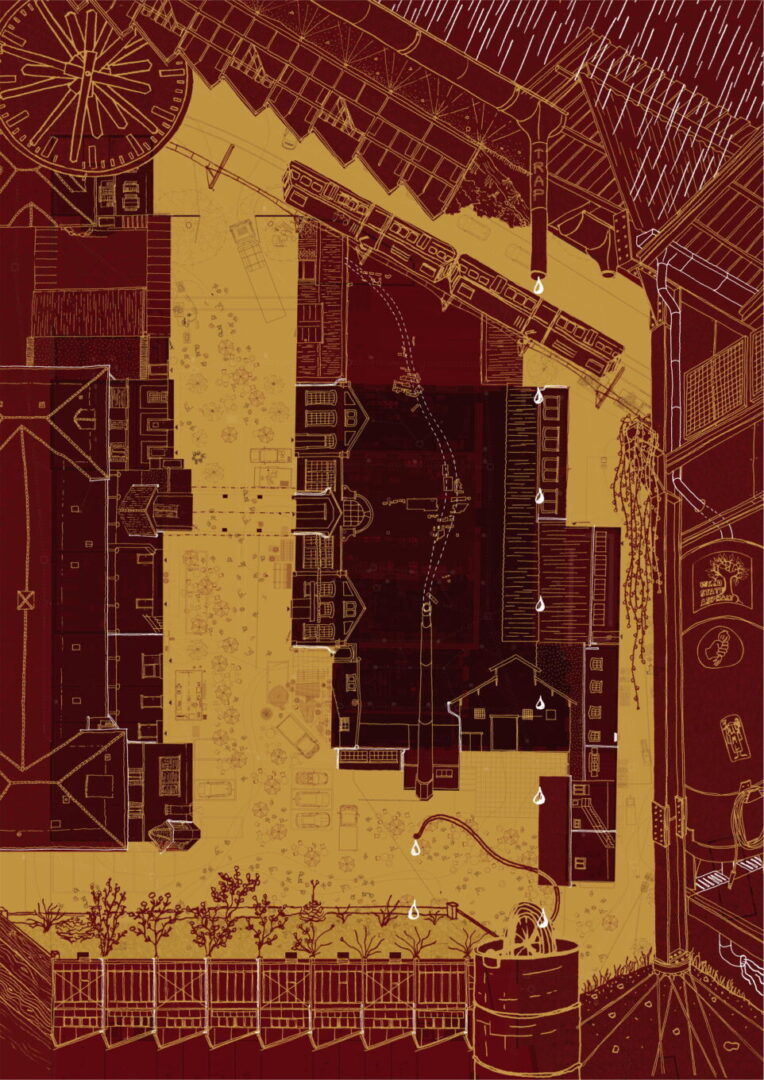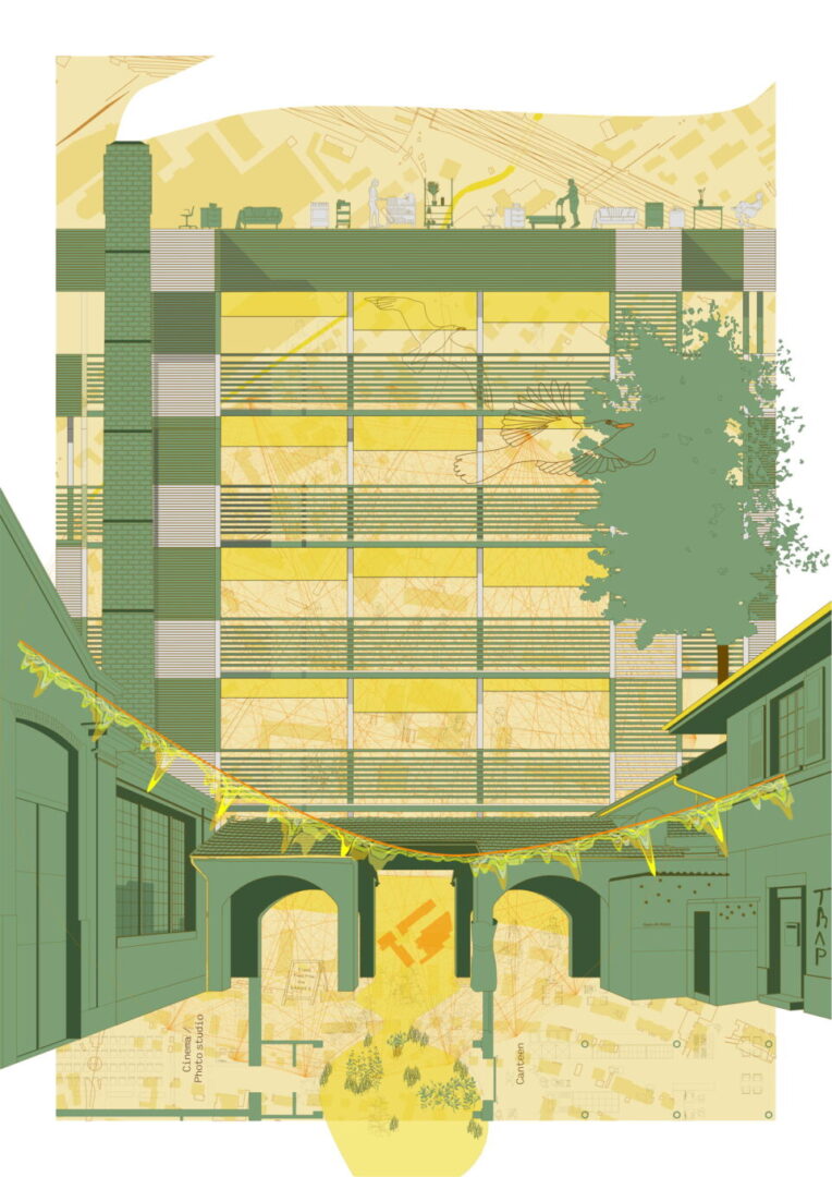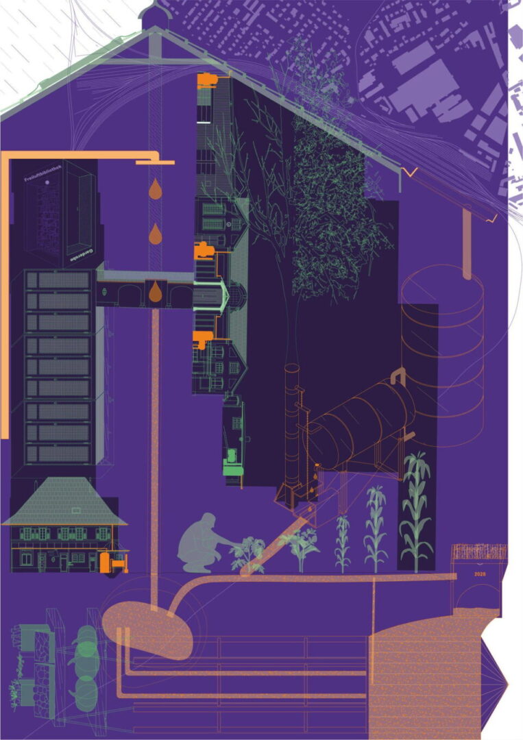 «You can’t fix it, you don’t own it», schreibt Dara Rüfenacht im Text zum dritten Projekt. Mit einer Fotostrecke dokumentiert sie den schlechten Zustand der Bausubstanz und schlägt als ersten Entwicklungsschritt das Einrichten eines Workshops vor, um die Gebäude – beginnend mit den Dächern – schrittweise sanft zu renovieren. Sie holt zudem den Schüsskanal aus dem Untergrund und entwirft einen geschlossenen Wasserkreislauf für das Areal. Damit werden auch die Gemeinschaftsgärten bewässert, die anstelle der heutigen Parkplätze angelegt werden und deren Produkte man in der Markthalle – der historischen Schlachthalle – kaufen kann.