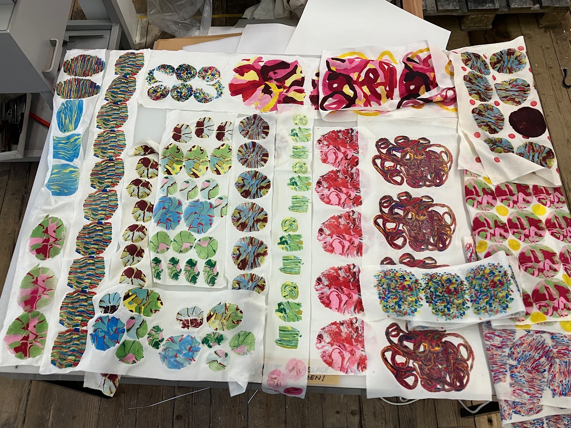 Nach zehn Wochen konnte ich endlich erste gestalterische Versuche unternehmen. Orbis ist ein unglaublich schönes Druckverfahren. Unlimitiert bunt, sehr spielerisch und nur bedingt planbar. Durch das Abtragen der Druckstöcke und Walzen verändert sich das Druckbild konstant und bekommt eine erzählerische, ephemere Qualität. Man weiss im Voraus nie genau, wie der Druck aussehen wird. Ich freue mich diese Technik weiterzuentwickeln, das gestalterische Potential auszuloten und herauszufinden, wie die doch sehr aufwändige Technik zeitgemässe Anwendungen finden könnte.