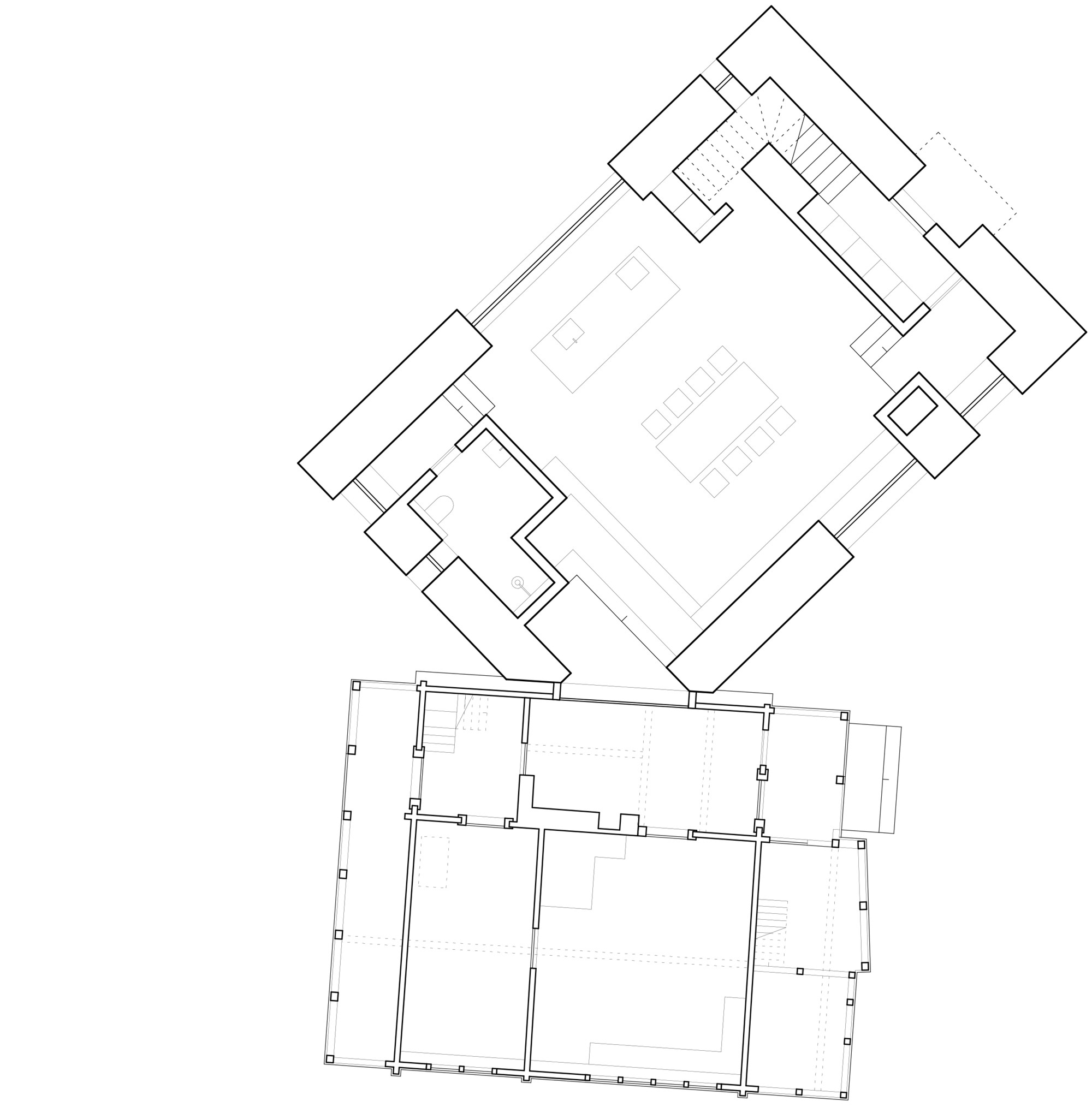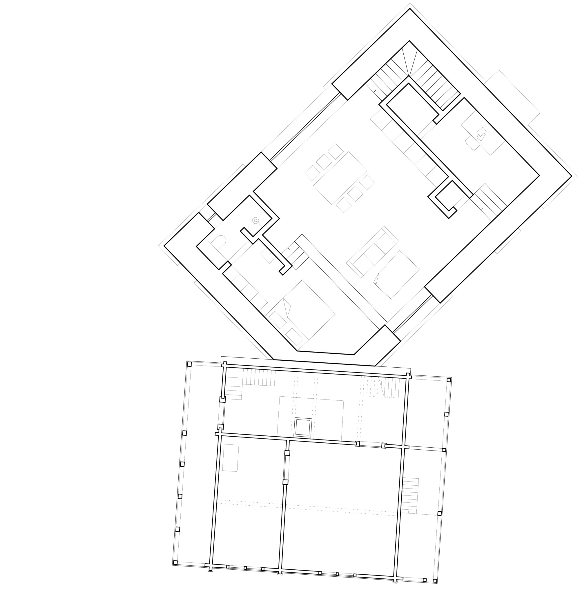 Die räumliche Organisation gliedert sich in einen nutzungsoffenen Raum im Erdgeschoss und eine kompakte Wohnung im Obergeschoss. Diese Verbindung erlaubt eine flexible Nutzung als Vereinshaus, Wohnraum oder Werkstatt. Der Strickbau bleibt ungedämmt und kann in unterschiedlicher Konfiguration mit dem Neubau als Drei-Jahreszeiten-Haus genutzt werden.