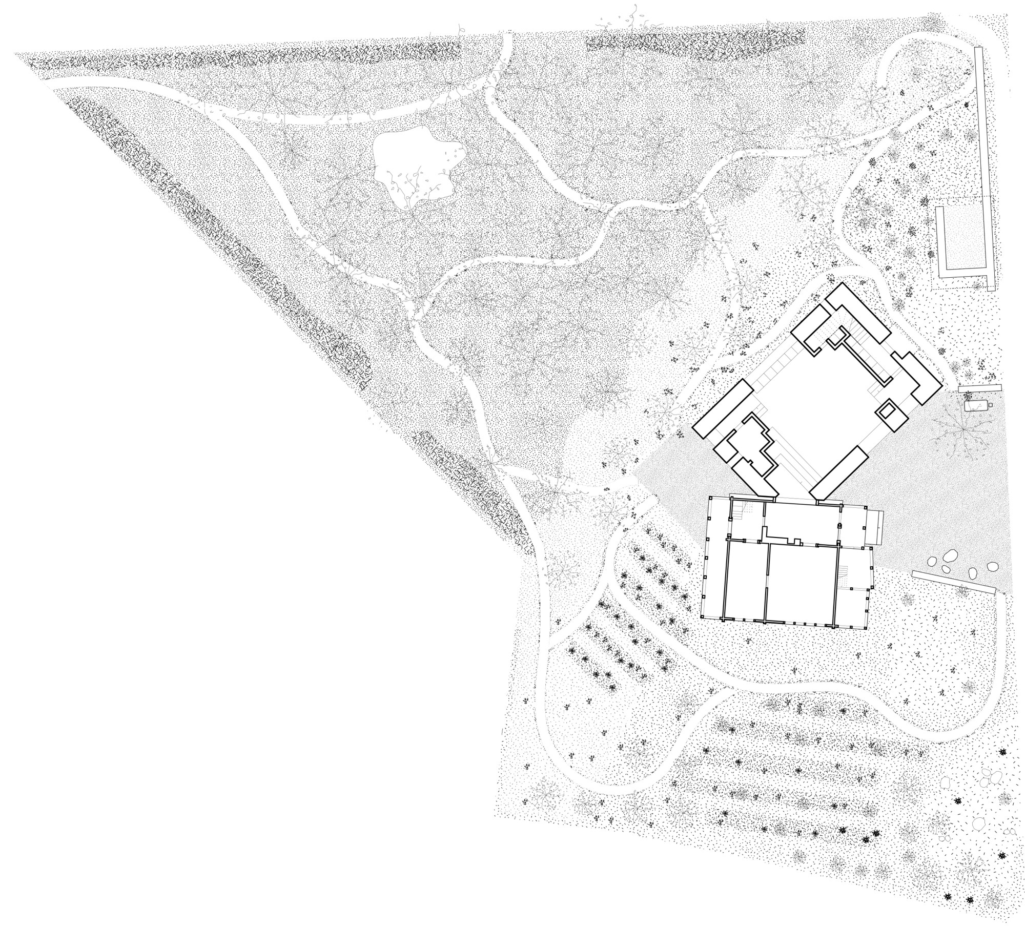 Der Neubau ist Teil eines neu angelegten Permakulturgartens, dessen Struktur aus essbaren Pflanzen, Teichen und Trockenbereichen eine ökologische wie soziale Erweiterung des Bauwerks bildet. Das Regenwasser sowie eine Trockentoilette werden auf dem Grundstück verarbeitet. In der Summe entsteht ein Ensemble, das Materialkreisläufe, Ortsbezug und gemeinschaftliches Handeln als integrale Bestandteile architektonischer Haltung formuliert. In der Gegenüberstellung des leichten, gefügten Holzbaus und des schweren, monolithischen Lehms entsteht eine Dualität, die weniger auf Kontrast als auf Ergänzung beruht.
