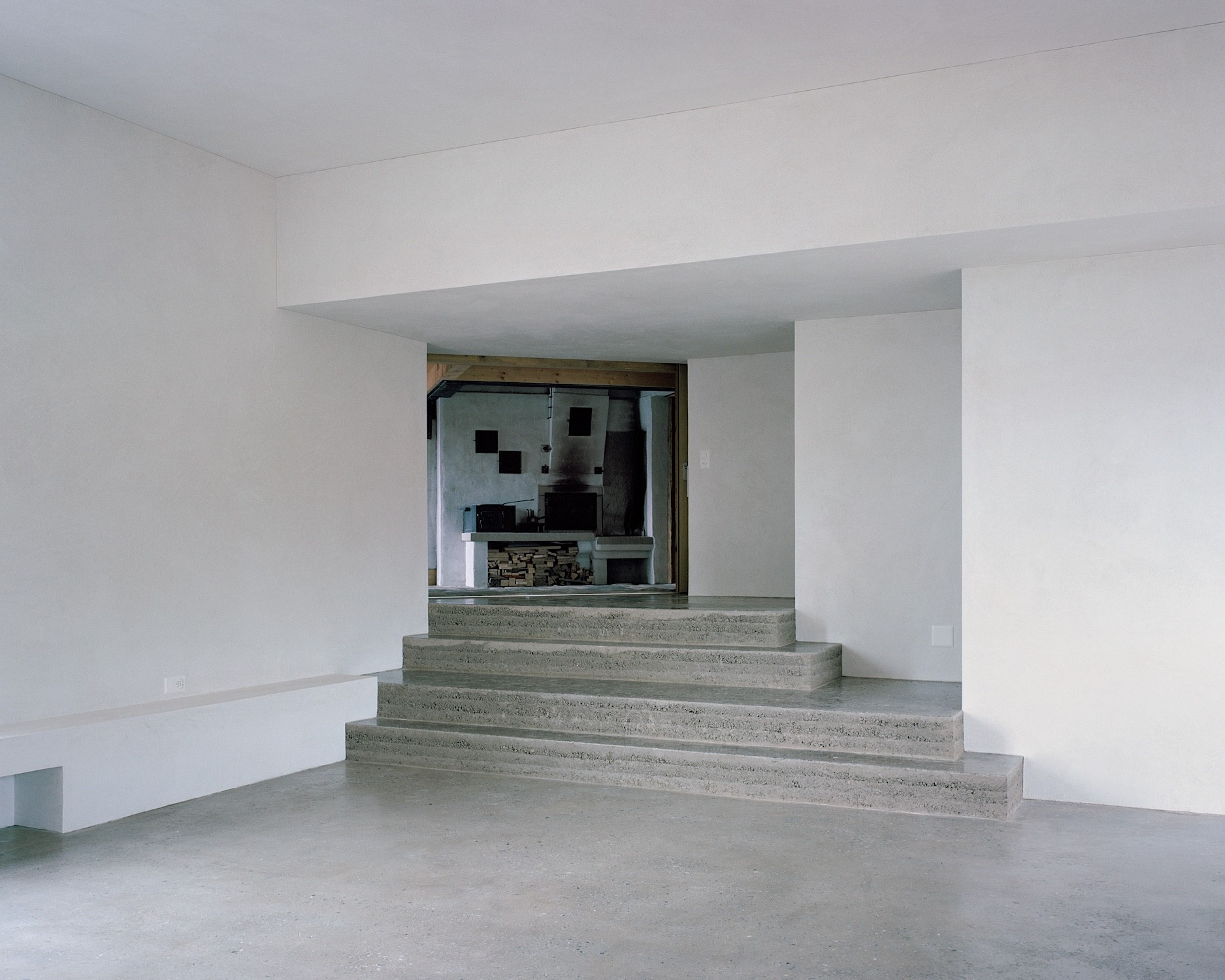 Der Anbau besteht aus einem massiven, tragenden Wandaufbau aus Stampflehm. Die Vor- und Rücksprünge der Fassade thematisieren die Herstellung der rund 200 Lehmelemente; die sichtbare Schichtung dokumentiert den Produktionsprozess. Die Decken bestehen aus unverleimten Holzbalken. Eine innere Schicht aus Hanfkalk dient der Wärmedämmung, während Kalkputz aus rezykliertem Ziegelmehl die Innenräume prägt. Der Boden aus lokalem Stampflehm, rohem Eichenholz und Tonplatten folgt dem Prinzip der sortenreinen Trennung. Das neue Haus ist aus nachwachsenden Rohstoffen gebaut, eine bewusste Reduktion auf das einfache Bauen mit Fokus auf die Rezyklierbarkeit der Materialien. Das Gebäude kann vollständig in den Stoffkreislauf zurückgeführt werden, ein Haus fast ohne Abfall.