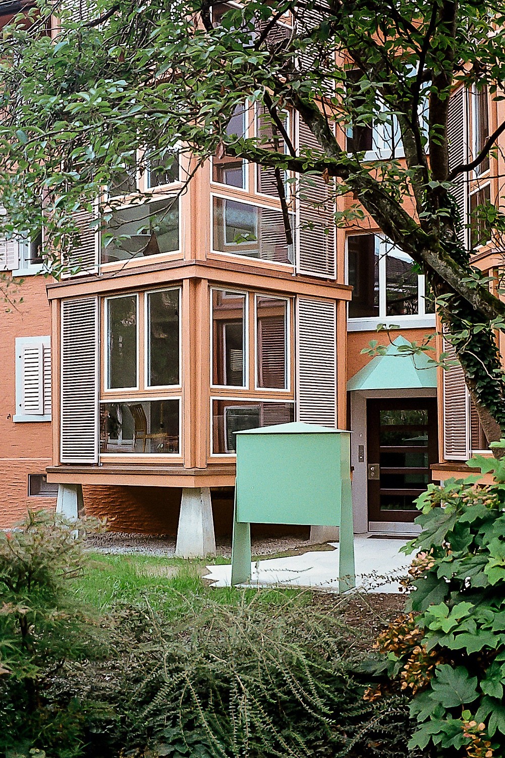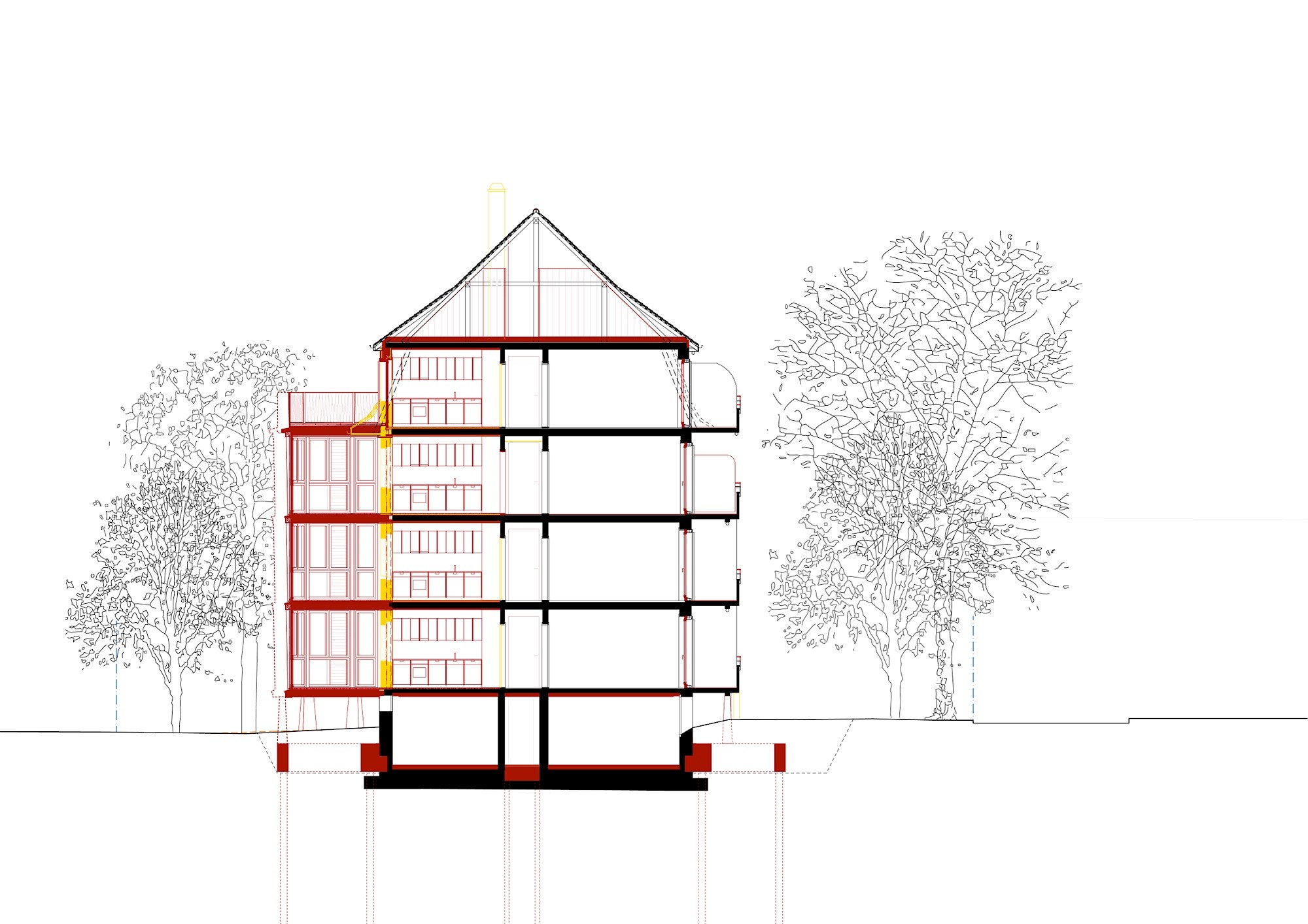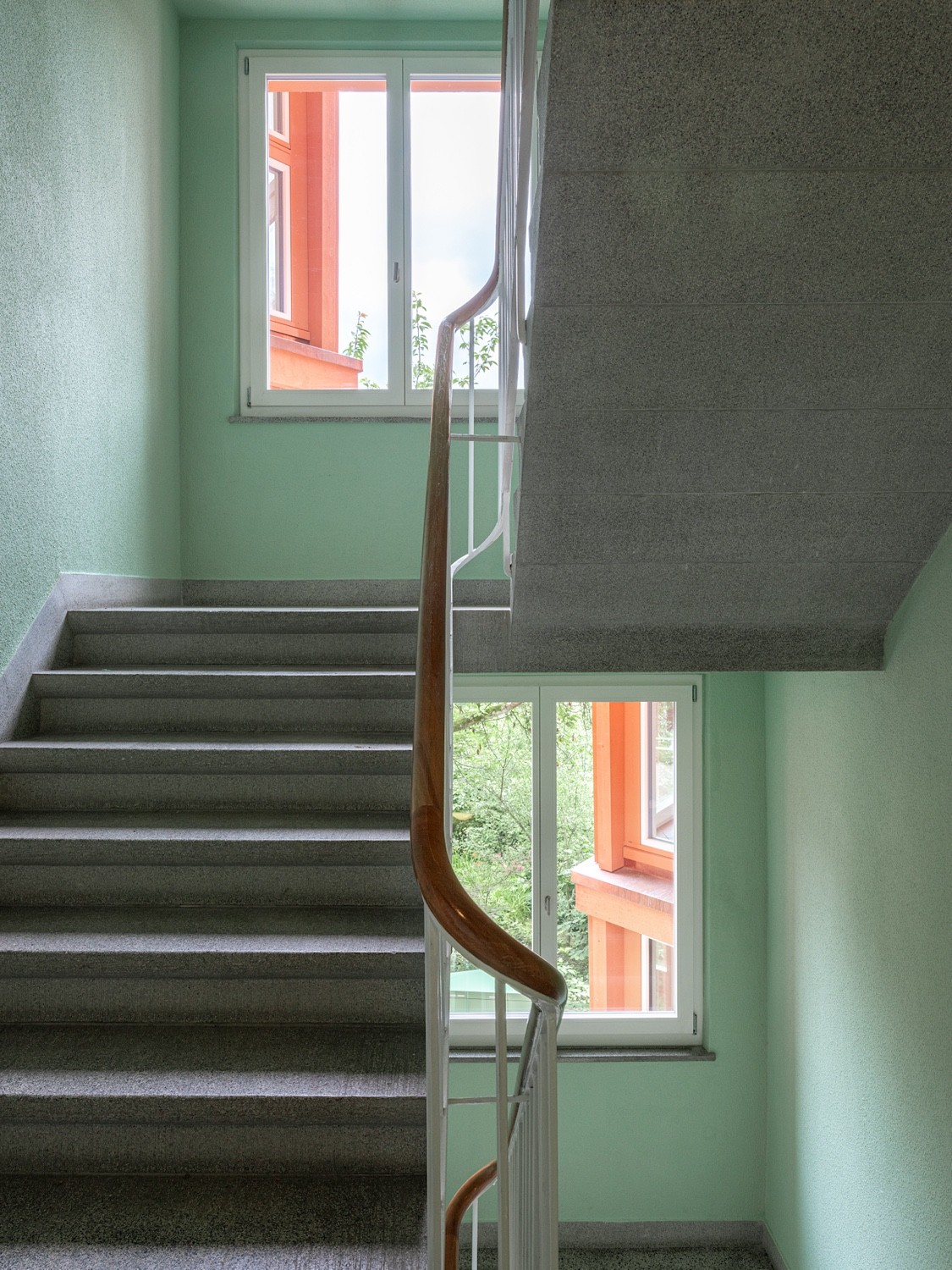 Die Geometrie der Anbauten ist dynamisch, die Räume scheinen zu fliessen und integrieren den Aussenraum in die Architektur. Durch diesen Dialog zwischen Innen und Aussen verwischen die Grenzen – ein introvertierter Bestand öffnet sich, wird durch Durchblicke in die neuen Anbauten extrovertierter und gewinnt eine neue Dimension der Wahrnehmung. Man befindet sich zwischen Leichtigkeit und Festigkeit, zwischen Alt und Neu. Ein fliessender Übergang, bei dem man den Altbau verlässt, doch gleichzeitig in ihn zurückblickt – sowohl nach innen als auch nach aussen.