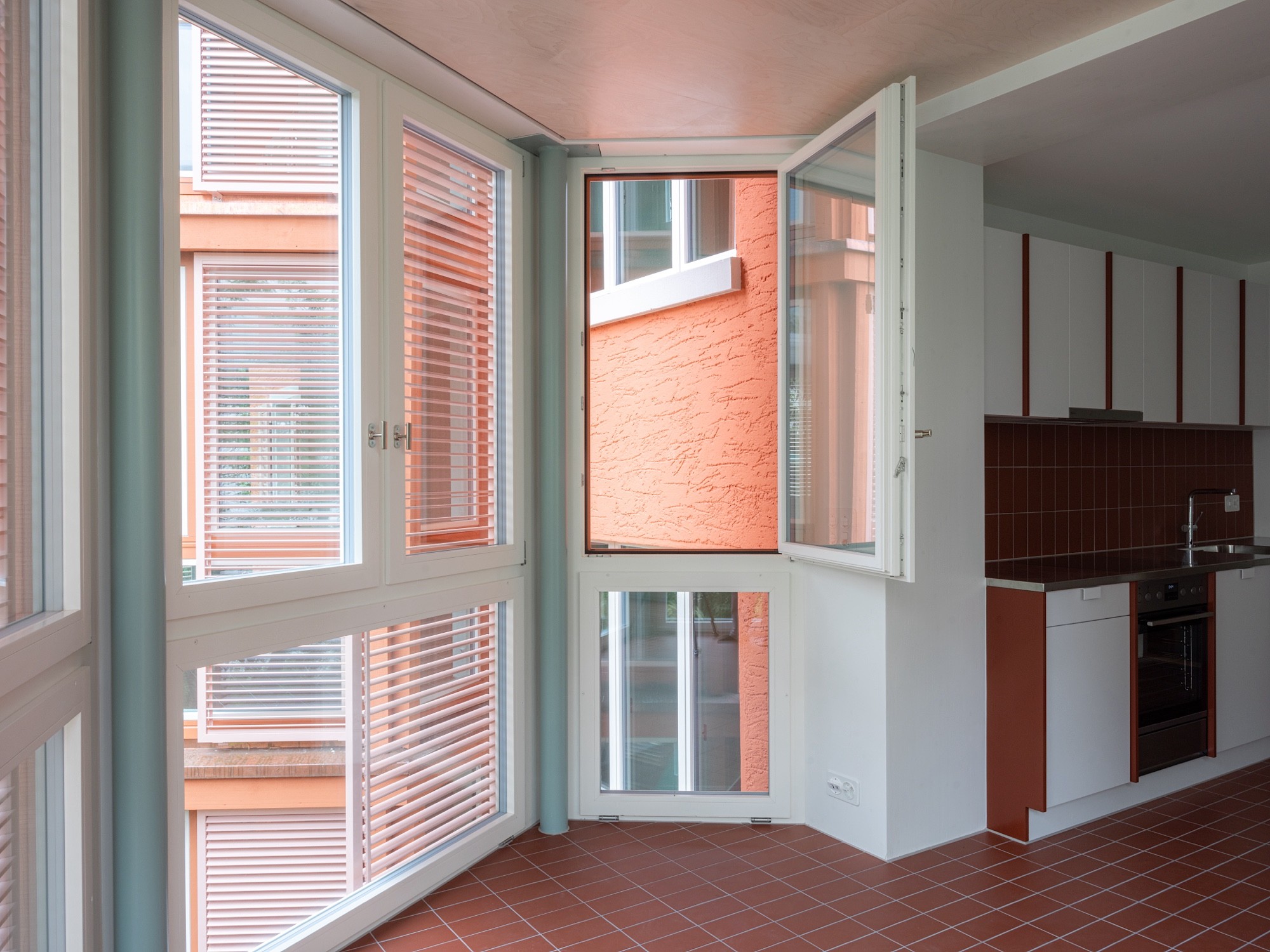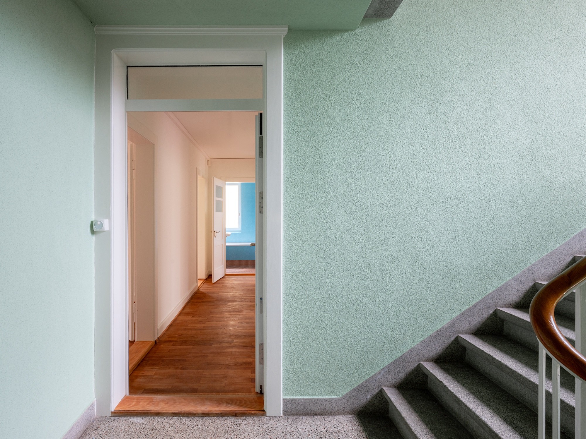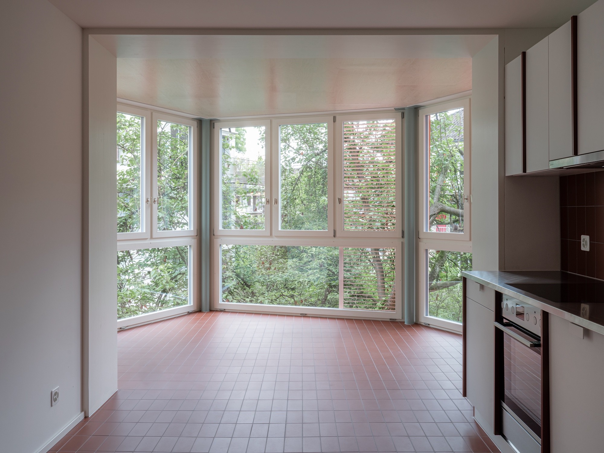 Das belichtete Treppenhaus, die Bäder an der Fassade, die dreiseitige Orientierung und der zentrale Gang, der alles erschliesst und eine neutrale Nutzung der Zimmer zulässt, werden als grosser Mehrwert für die Wohnungen erachtet. Mit einem geschickten Abtausch der bestehenden Küche mit dem danebenliegenden Zimmer entsteht ein neues Eckzimmer mit zweiseitiger Orientierung.