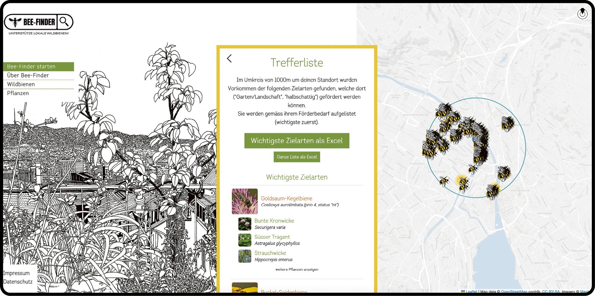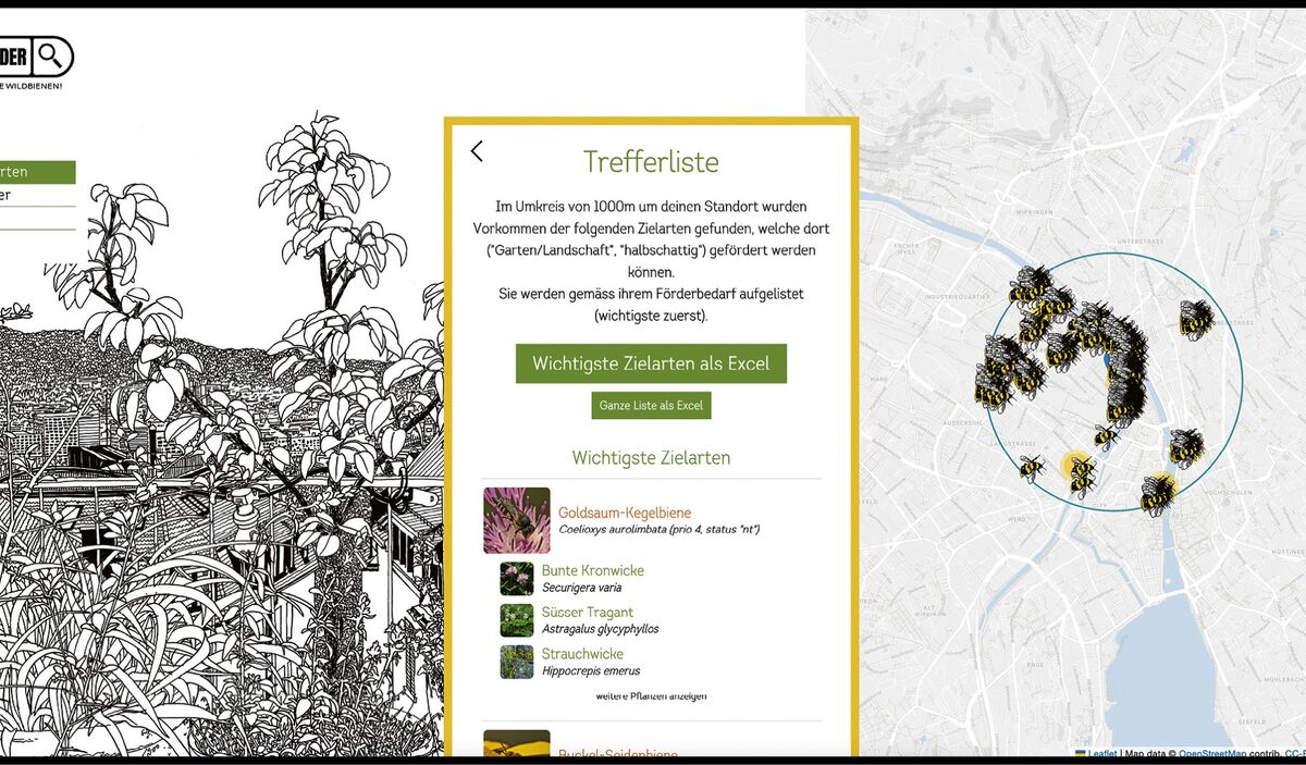 Wachsen die richtigen Pflanzen, finden die Bienen Lebensraum. Damit dies passiert, gibts heute Massnahmen und Bepflanzungsratgeber, aber die sind nicht sehr genau, gerade weil die Habitate der Wildbienen sehr klein und divers sind. ‹Bee-Finder› möchte hier Abhilfe schaffen und liefert punktgenaue, georeferenzierte Empfehlungen. Die App hilft bei der naturgerechten Bepflanzung von Grünflächen, indem sie zu jeder Wildbienenart die passenden Pflanzen erfasst. Sie zeigt, welche Bepflanzung welche Arten fördert und was es zu beachten gilt. Sie ist eine Unterstützung nicht nur für private Balkon- und Gartenbesitzerinnen, sondern auch für die öffentliche Hand oder Firmen. Letztere verwalten grosse Freiflächen, die sich für die Förderung der Biodiversität eignen, etwa Dachflächen oder Grünstreifen an Strassen und Parkplätzen.
