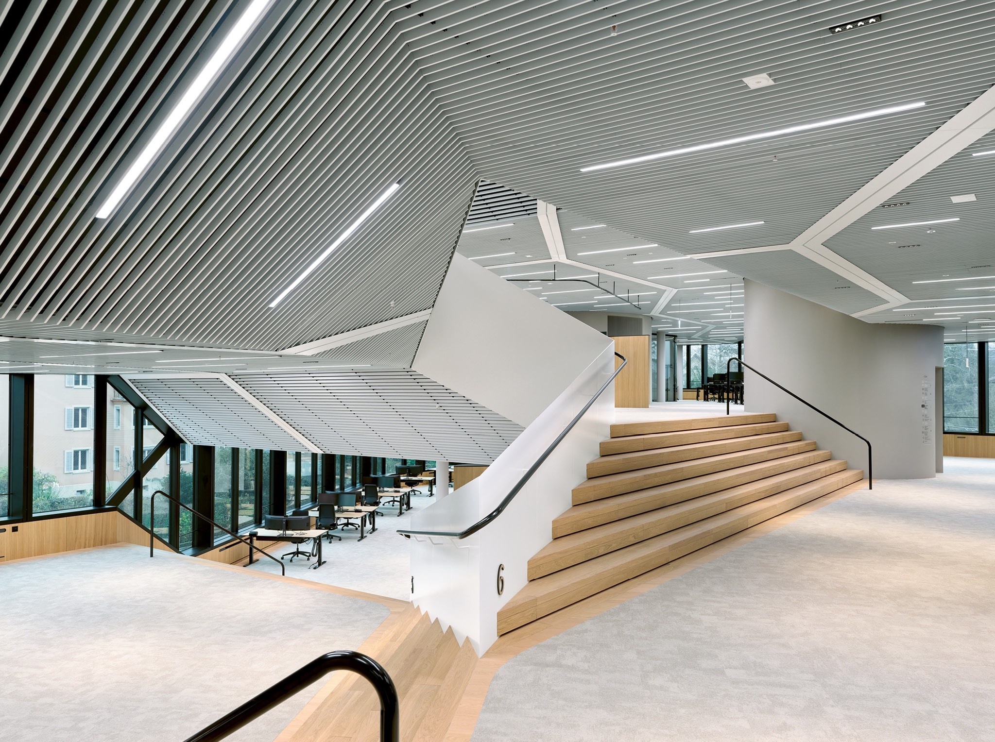 Im neuen Swica-Hauptsitz verbinden breite Treppen jede Plattform mit den beiden benachbarten Flächen.