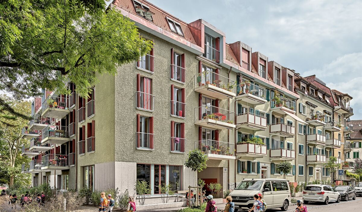 In Zürich Wiedikon spielen Zimmermann Sutter drei Varianten der Nachverdichtung in nur einem Entwurf durch. Das Projekt für eine Wohnbaugenossenschaft umfasst drei Häuser: Das erste wurde aufgestockt, das zweite saniert, das dritte durch einen Neubau ersetzt. Weil die Einzelprojekte gut etappiert werden konnten, blieb die Erneuerung auch sozial- und quartierverträglich. Saniert wurde im bewohnten Zustand und mit dem Ziel, die günstigen Mieten zu erhalten. So wurden die Fassaden aus dem Jahr 1923 nicht aufwendig isoliert, sondern nur die Fenster erneuert. Ausserdem wurden das Dach, der Keller und eine Stirnfassade gedämmt. Das Ergebnis: Im sanierten Teil kostet eine der zwölf 3-Zimmer-Wohnungen nur zwischen 1082 und 1281 Franken Miete pro Monat.