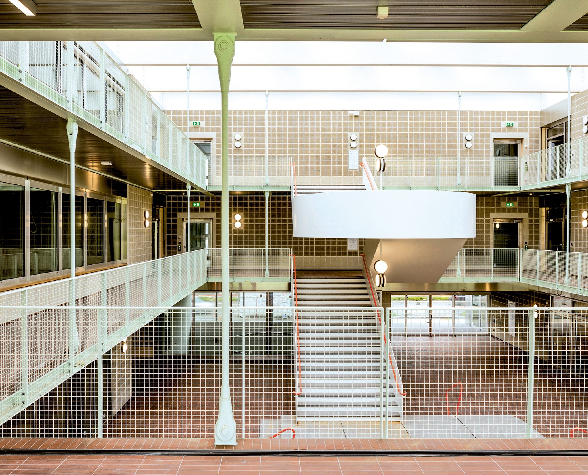 So auch das neue Primarschulhaus Guggach. Zusammen mit der benachbarten Wohnsiedlung von Doscre Architekten und dem beides verbindenden Park von Atelier Loidl ist es Teil eines gemeinsamen städtebaulichen Wettbewerbsprojekts. Die Lage am Park inspirierte das Büro Weyell Zipse zur Kernidee: zu einem grossen, glasüberdeckten Atrium, dessen riesiges Glastor sich zum Park hin öffnen lässt. Die unbeheizte Halle ist Ankunftsort der Kinder. Hier gelangen sie über eine grosse Freitreppe zu ihrem Schulzimmer auf der ersten oder zweiten Etage. Bei schönem Wetter steht das Tor offen, und sie können die Halle auch für den Unterricht nutzen. Denn deren Galerieumgang weitet sich vor der Parköffnung zu einer Terrasse, so gross wie ein Klassenzimmer – eine Reminiszenz an die von Johannes Duiker erbaute, inzwischen fast 100-jährige Freiluftschule in Amsterdam. Das Schulgebäude «umarme» den Hofraum, so beschreiben es die Architekten. Ein Raum, der trotz seiner Offenheit auch Geborgenheit ausstrahlen soll.