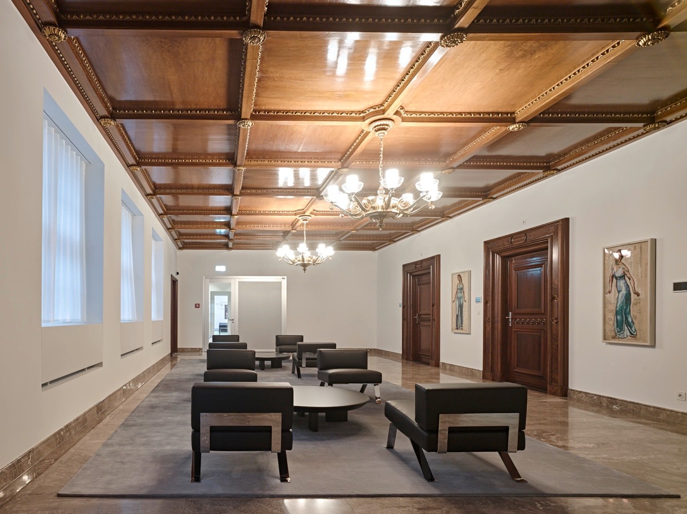 Die Vestibüle, der Korridorring, die Sitzungssäle der Konzernleitung und die Kundenräume sind mit Parkett belegt. Der dunkle Farbton der Räuchereiche, die breiten Riemen und die abgeschrägten Kanten verankern den Belag in der Gegenwart, die Verlegeart im Fischgratmuster verweist auf die Vergangenheit. In den Vestibülen setzen Teppiche farbige Akzente.