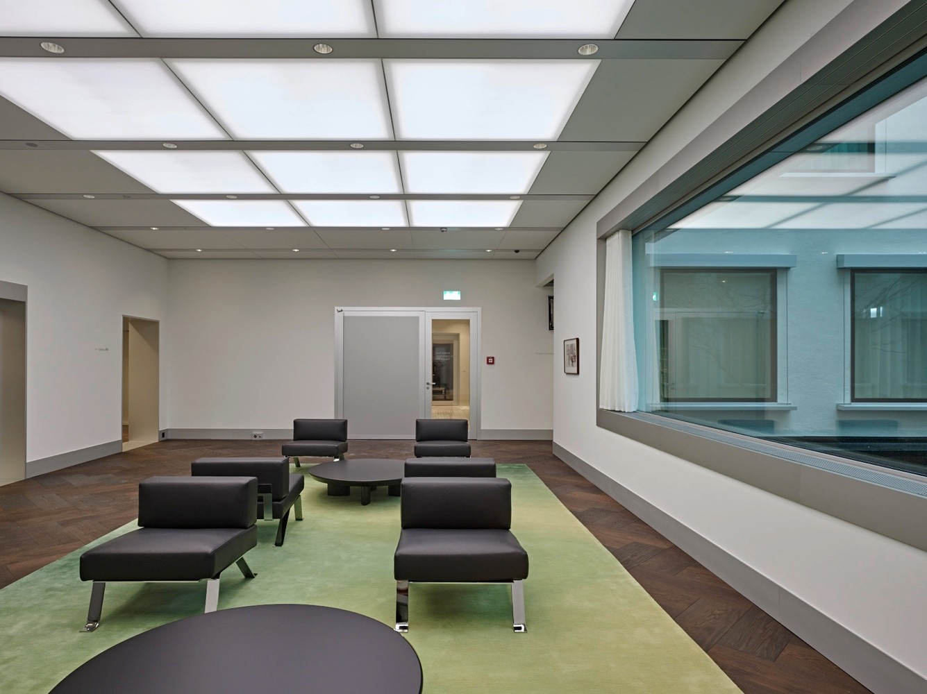 An den Decken bildet ein eigens entwickeltes System von breiten Funktionsschienen aus Aluminium einen Raster. Darin eingelegt sind die Elemente der stoffbespannten Kühldecke. Dieses Prinzip gilt auch im grossen Saal der Konzernleitung, bloss folgen die Aluminiumprofile hier einer eigenen Ordnung. Der Künstler und Geometrie-Ingenieur Urs B. Roth überführte die Ellipsenform des Sitzungstisches in eine rechteckige Deckengeometrie. Dadurch sind die 43 Leuchtenpunkte präzis auf die Deckenfelder und auf den Tisch abgestimmt. Dieser besteht – wie die Empfangskorpusse im Haus – aus Brauneiche.
