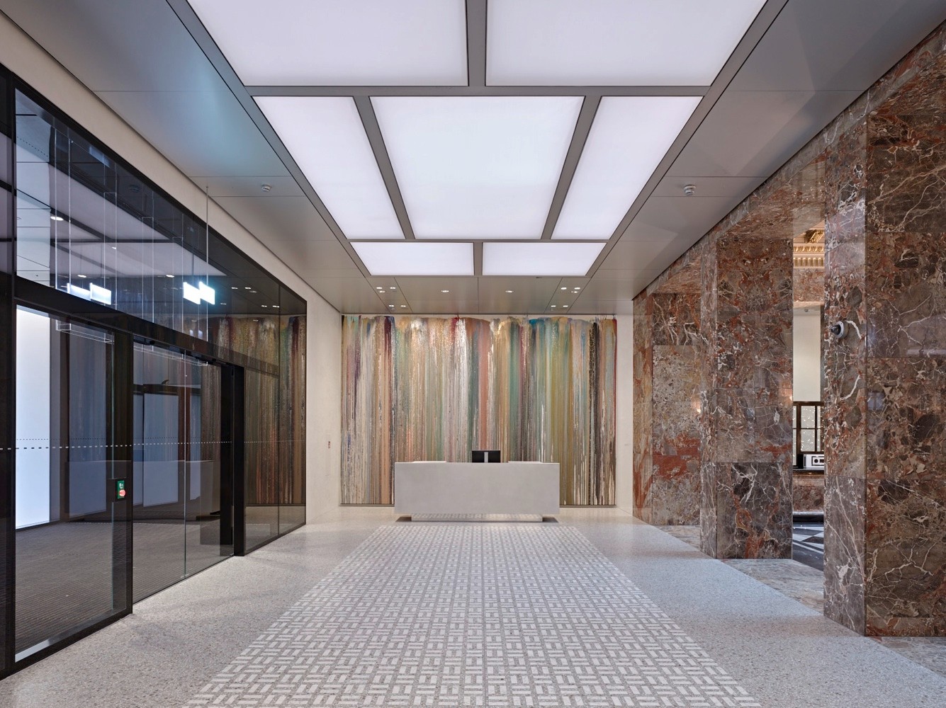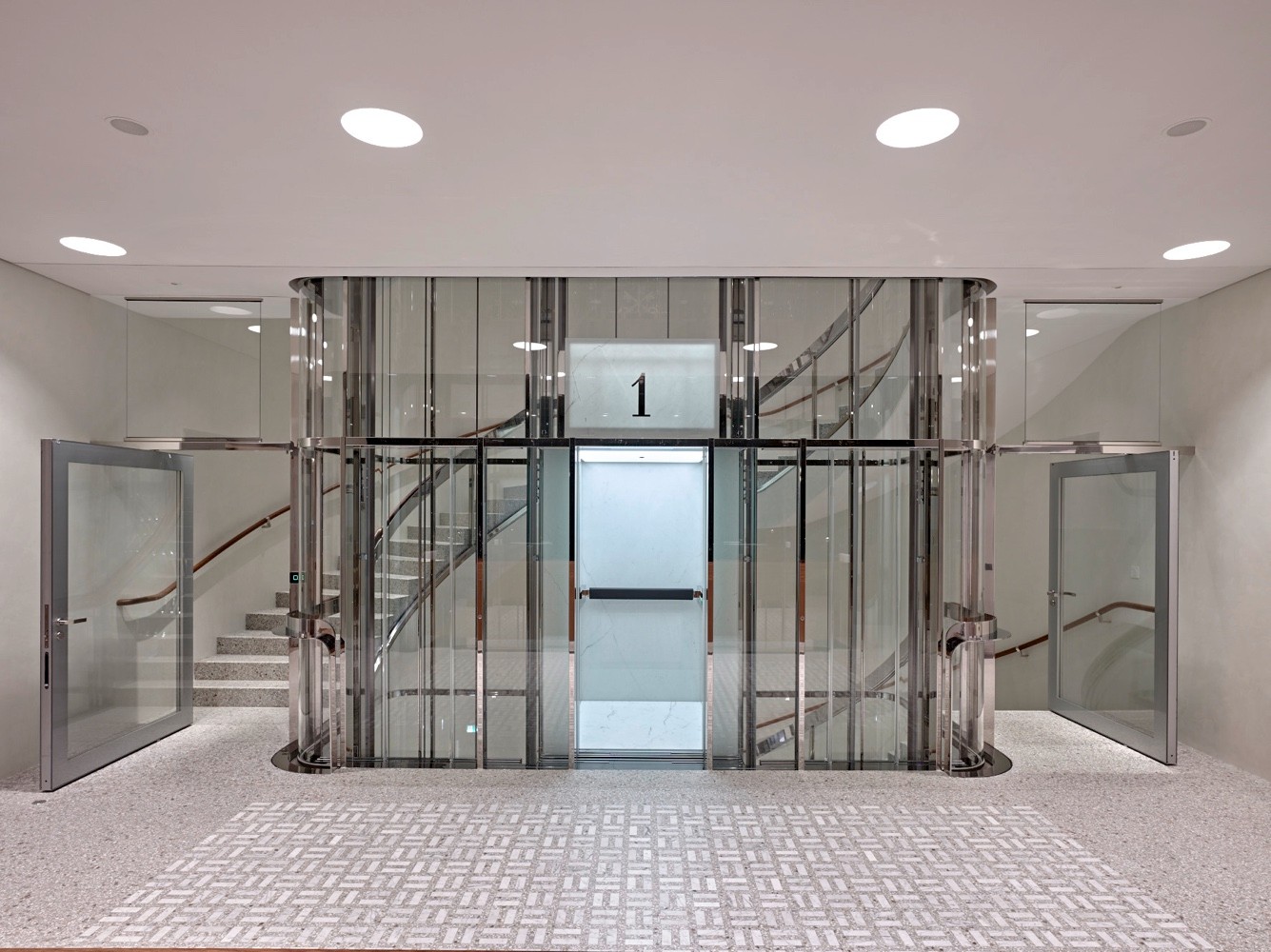 Auch die Liftkabine sieht aus der Ferne aus, als wäre sie aus Milchglas. Doch die genaue Betrachtung zeigt: Es ist Naturstein. Eine hauchdünne, gerade mal 0,7 Millimeter dicke Schicht aus Carrara-Marmor ist zwischen zwei Gläser gespannt. Damit kann sich die Kundschaft im gläsernen Lift diskret bewegen, und er ist zum Bauteil geworden, das die Ansprüche der UBS an einen zeitgemässen Hauptsitz in sich vereint: so viel Offenheit und Transparenz wie möglich, so viel Diskretion wie nötig.