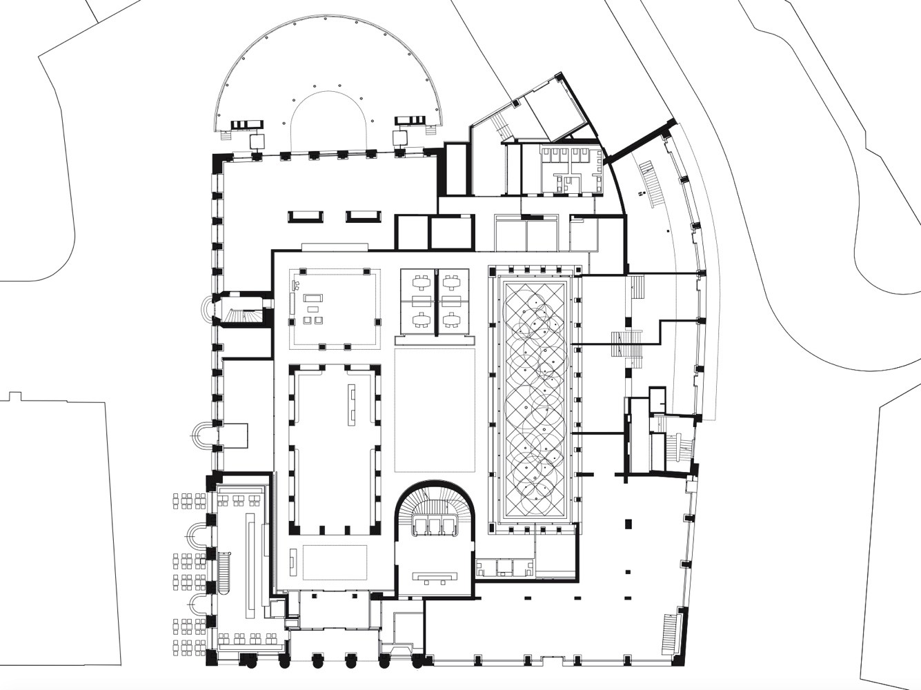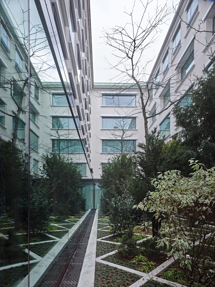 Nun gaben EM2N diesem zweiten Hof die nötige Präsenz, um als Orientierungspunkt zu funktionieren. Die Architekten hoben die längst nicht mehr benötigte Wertschriftenhalle auf und führten stattdessen den Hof bis auf den Boden des Erdgeschosses. Die Dimensionen blieben dabei ebenso erhalten wie die Stützenverkleidung aus grauem Naturstein. Doch der Raum wurde umgepolt: Bewegte sich früher in diesem Bereich das Publikum, kann es ihn heute nur noch von aussen betrachten. Die einstige Halle ist zu einem dicht bepflanzten, von den Landschaftsarchitekten Balliana Schubert gestalteten Grünraum geworden.