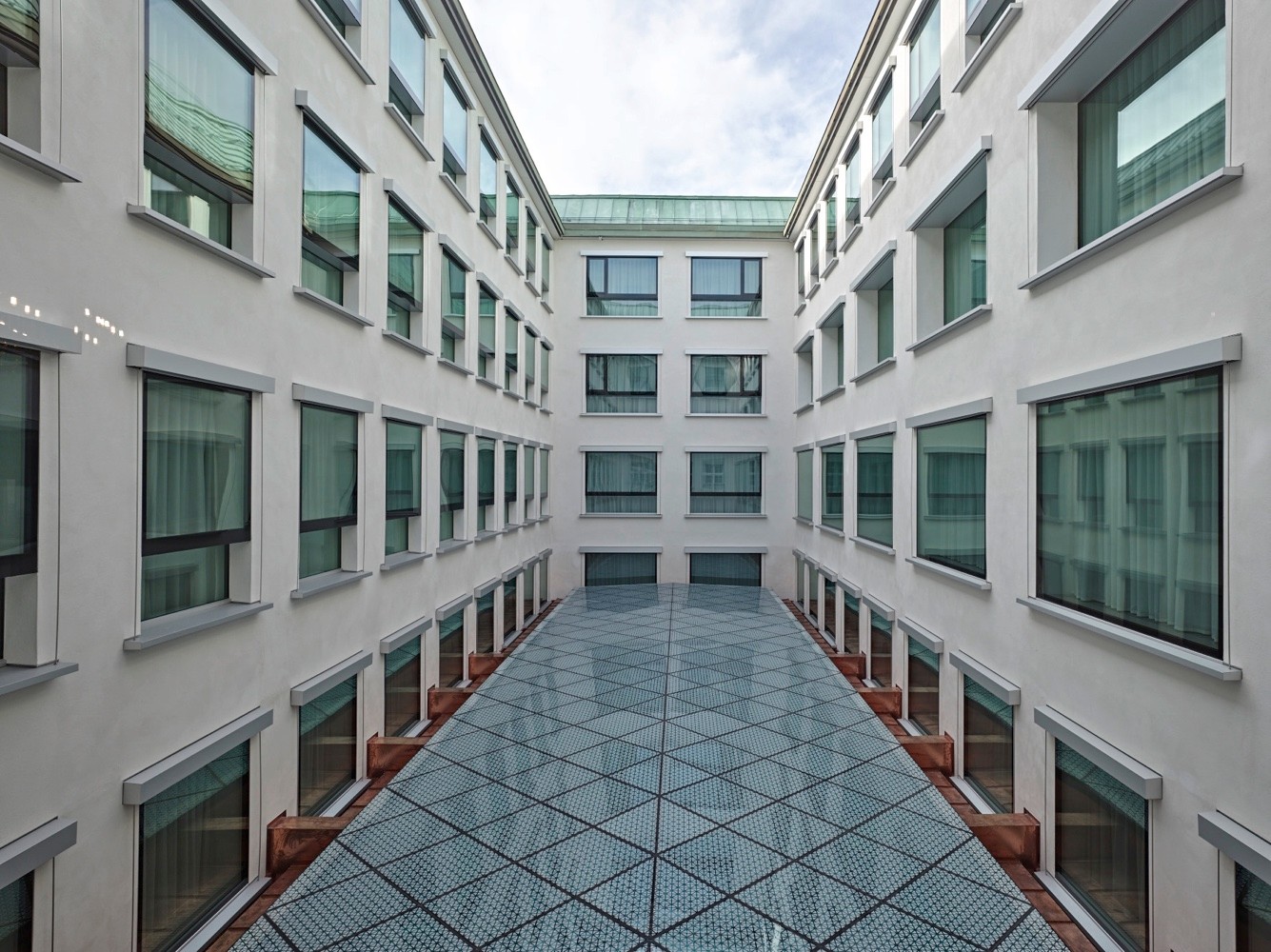 Im Innern war von der ursprünglichen Substanz nur noch wenig vorhanden. Geschützt sind neben der historischen Schalterhalle und mehreren Treppenhaus- und Liftanlagen das Tragwerk aus den Fünfzigerjahren und etliche Schächte. EM2N entwickelten eine Material- und Farbpalette, die dem neuen Münzhof einen starken Charakter gibt, sich aber gleichzeitig auch an das Vorhandene anlehnt. So sind die öffentlichen Bereiche des Erdgeschosses, das UBS-Forum und die Haupttreppe samt Vorplatz mit einem Terrazzoboden belegt. Dieser führt die steinerne Fassade ins Innere und vermittelt zu den historischen Belägen in der Schalterhalle und den Treppenhäusern. In einzelnen Bereichen veredeln ihn Naturstein-Intarsien wie ein imaginärer Teppich.