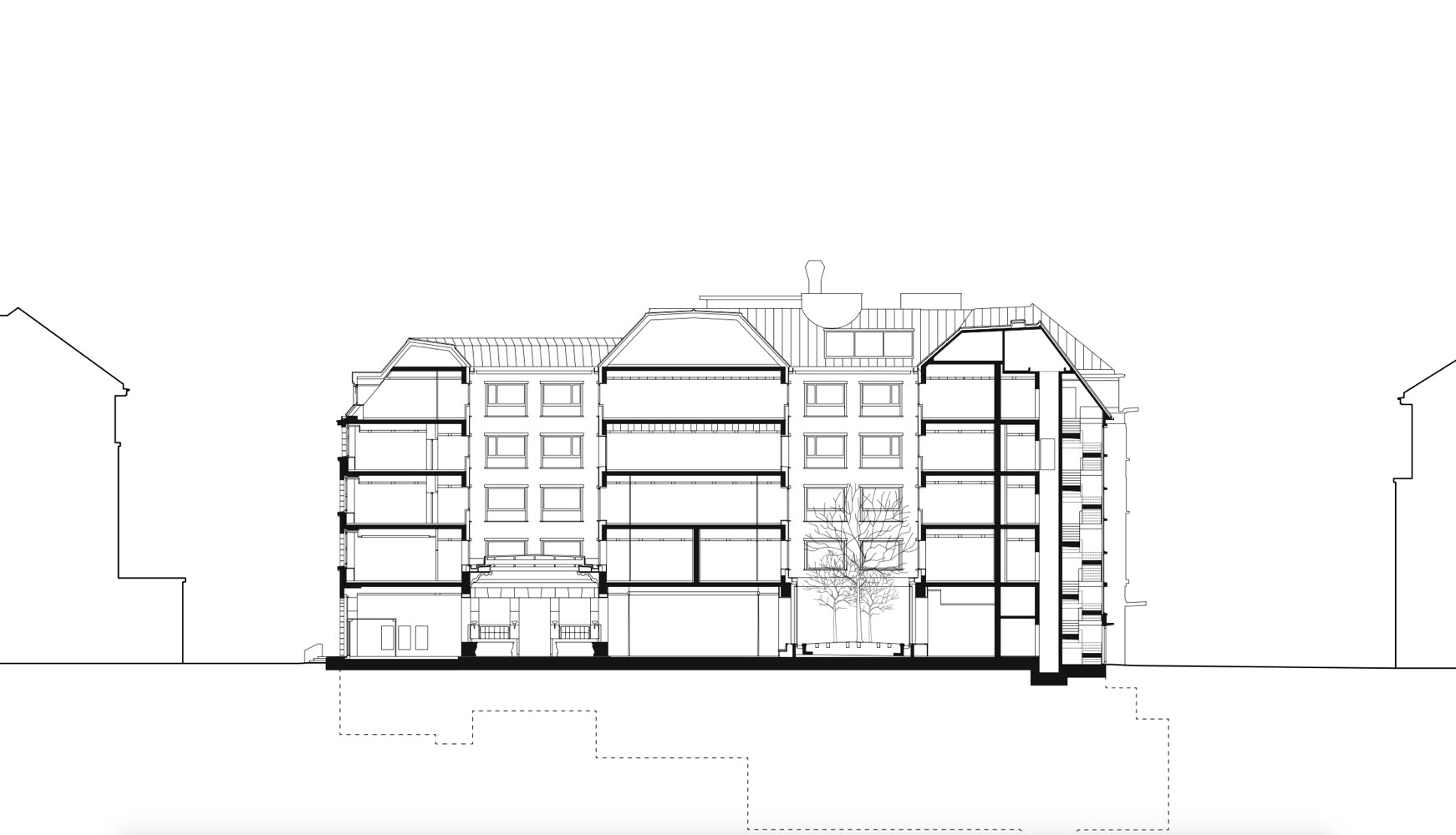 Bei den Materialien bewegten sich EM2N im Spannungsfeld zwischen dem Bestand und dem Anspruch, ein modernes, offenes Gebäude zu schaffen. Im Zuge der Erweiterung vor sechzig Jahren zogen die Architekten an der Bahnhofstrasse für den neuen Teil einfach das historische Kleid des Münzhofs weiter. Erst an der Pelikan- und der Nüschelerstrasse war der Neubau als solcher zu erkennen. Weil inzwischen der ganze Komplex unter Denkmalschutz steht, stellten sich EM2N die Frage nach dem richtigen Gesicht gar nicht. Die Fassaden waren ebenso zu erhalten wie die grün verwitterten Kupferdächer. Gestaltungsspielraum gab es bei den Hoffassaden, die neu aufgebaut wurden. Im Einklang mit der Denkmalpflege gestalteten die Architekten diese als verputzte Lochfassaden.