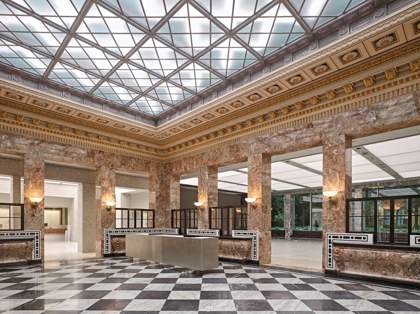 Nun gaben EM2N diesem zweiten Hof die nötige Präsenz, um als Orientierungspunkt zu funktionieren. Die Architekten hoben die längst nicht mehr benötigte Wertschriftenhalle auf und führten stattdessen den Hof bis auf den Boden des Erdgeschosses. Die Dimensionen blieben dabei ebenso erhalten wie die Stützenverkleidung aus grauem Naturstein. Doch der Raum wurde umgepolt: Bewegte sich früher in diesem Bereich das Publikum, kann es ihn heute nur noch von aussen betrachten. Die einstige Halle ist zu einem dicht bepflanzten, von den Landschaftsarchitekten Balliana Schubert gestalteten Grünraum geworden.