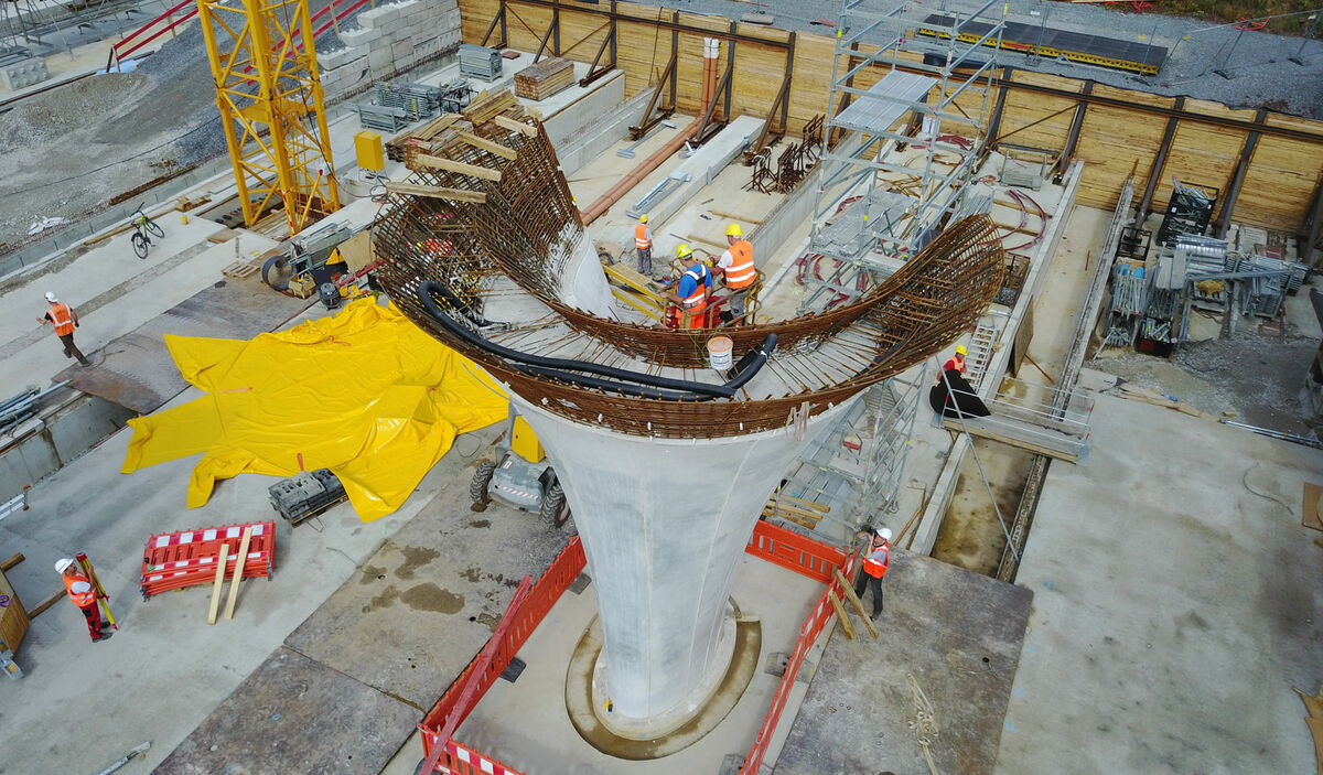 Wieder zurück auf den Boden brachte Bechmann die Gäste mit dem Bahnhof Stuttgart 21. Die Struktur überwölbt mit nur 36 Zentimetern Stärke bis zu 30 Meter. Die tropfenförmigen Oberlichter im Park über den Geleisen hatte einst Frei Otto analog entworfen. Weil die Schalen nur auf Druck belastet sind, hätten sie ohne Bewehrung auskommen sollen. Die digitalen Berechnungen zeigten jedoch, dass es wegen der Erdkräfte doch Armierungseisen braucht, die die Planer am 3D-Modell aneinander vorbei fädelten.