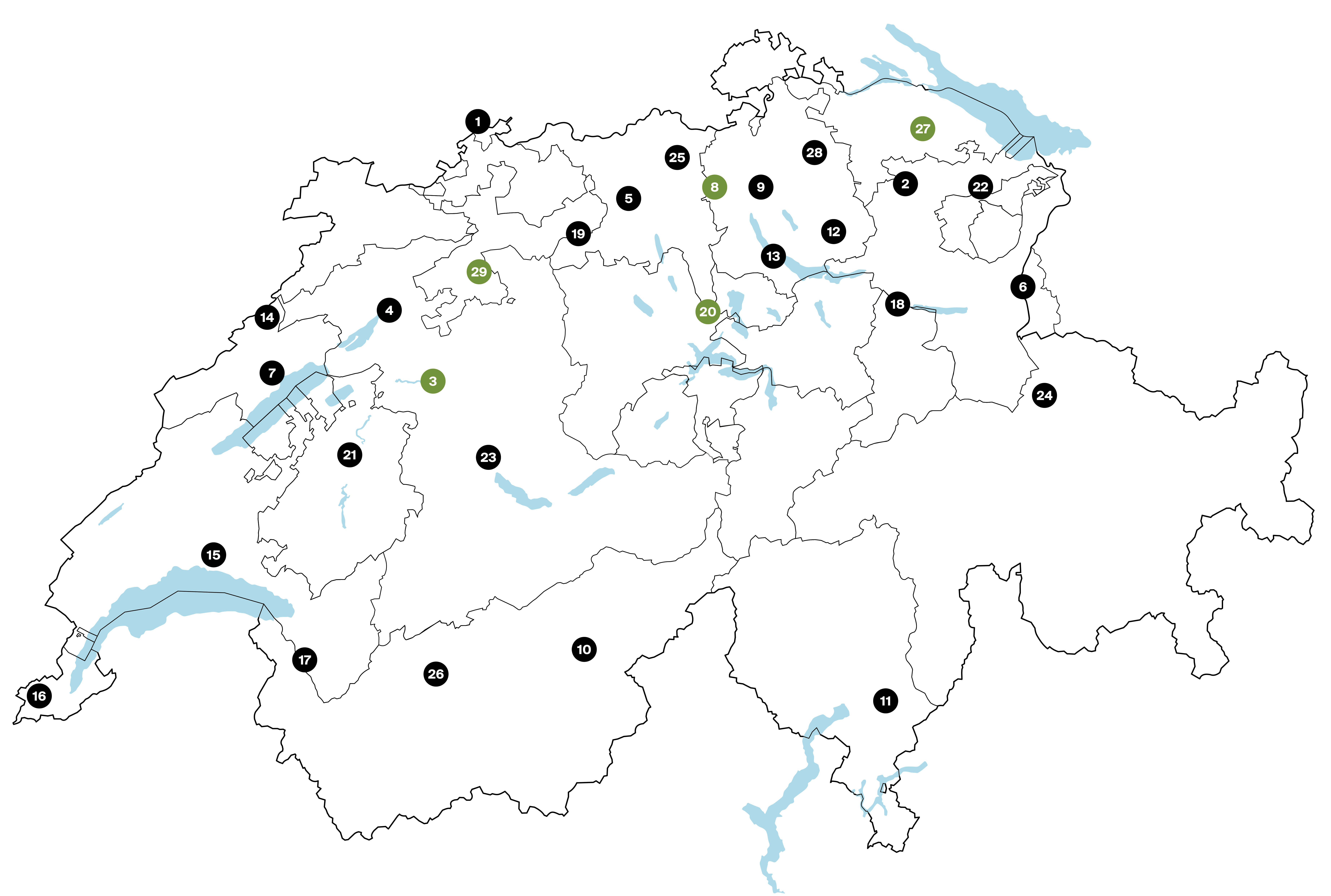 1 KVA Basel (IWB): Inbetriebnahme 1999, 2 KVA Bazenheid SG (ZAB): Inbetriebnahme 1976, 3 Energiezentrale Forsthaus, Bern (EWB): Inbetriebnahme 2012, 4 KVA Brügg BE (Müve Biel-Seeland): Inbetriebnahme 1967, 5 KVA Buchs AG (GEKAL): Inbetriebnahme 1973, 6 KVA Buchs SG (VFA): Inbetriebnahme 1962, Neubau geplant 2030–2034, 7 UVTD Colombier NE (VADEC): Inbetriebnahme 1971, 8 LEZ Dietikon ZH (LIMECO): Inbetriebnahme 1971, Neubau geplant 2025–2034, 9 KVA Hagenholz, Zürich (ERZ): Inbetriebnahme 1969, 10 KVA Gamsen VS (REVO): Inbetriebnahme 1972, 11 ICTR Giubiasco TI (ACR): Inbetriebnahme 2009, 12 KVA Hinwil ZH (KEZO): Inbetriebnahme 1963, Neubau geplant 2027–2030, 13 KVA Horgen ZH (EZI): Inbetriebnahme 1967, 14 UVTD La Chaux-de-Fonds NE (VADEC): Inbetriebnahme 1972, Neubau geplant 2027–2031, 15 UVTD Lausanne VD (TRIDEL): Inbetriebnahme 2006, 16 KVA Les Cheneviers GE (SIG): Inbetriebnahme 1996, 17 KVA Monthey GE (SATOM): Inbetriebnahme 1976, 18 KVA Linth, Niederurnen GL: Inbetriebnahme 1971, 19 KVO Oftringen (ERZO): Inbetriebnahme 1972, Neubau geplant 2027–2032, 20 KVA Perlen (Renergia): Inbetriebnahme 2015, 21 KVA Posieux FR (SAIDEF): Inbetriebnahme 2001, 22 KVA St. Gallen: Inbetriebnahme 1972, 23 KVA Thun BE (AVAG): Inbetriebnahme 2003, 24 KVA Trimmis GR (GEVAG): Inbetriebnahme 1975, 25 KVA Turgi AG: Inbetriebnahme 1970, 26 UVTD Uvrier VS (ENEVI): Inbetriebnahme 1971, 27 KVA Weinfelden TG: Inbetriebnahme 1996, Neubau geplant 2026–2031, 28 KVA Winterthur: Inbetriebnahme 1965, 29 KVA Emmenspitz SO (KENOVA): Inbetriebnahme 2025. Quelle: VBSA