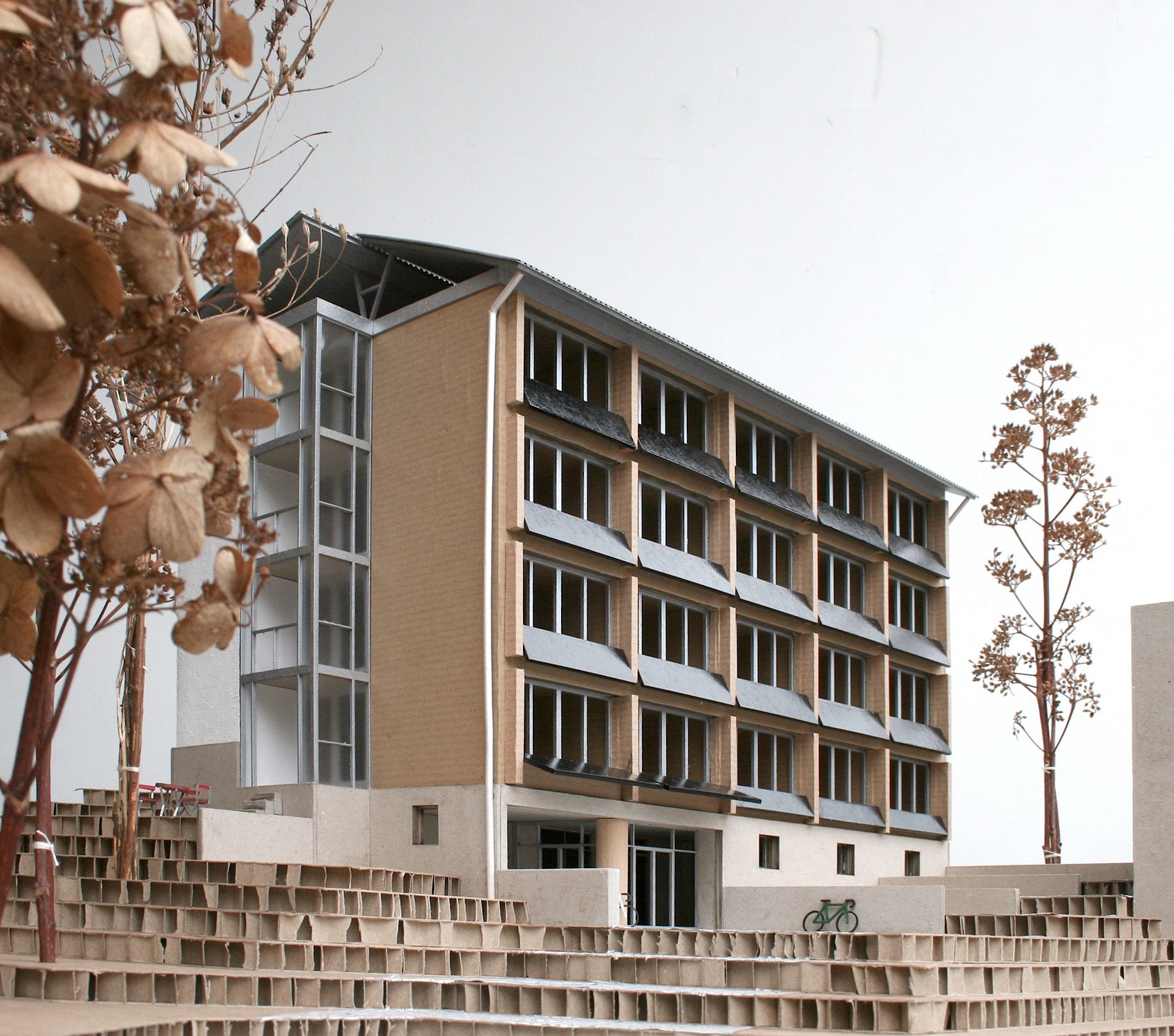 In drei Schichten zum Sieg Das Siegerprojekt ‹Babetin› stach nicht nur mit der höchsten Belegungsdichte, sondern auch mit seinem einfachen, aber innovativen Grundriss heraus. Baseli Candrian und Annina Meier organisieren die Wohnungen in einem Dreischichtprinzip, das sich auch an der Fassade abzeichnet. In der mittleren Schicht ordnen sie eine Ess- und Kochhalle an, die zugleich als Erschliessung für die anderen Räume dient und in einer Loggia an der Stirnseite des Gebäudes endet. Die südseitige Schicht besteht aus grosszügig verglasten Zimmern, die wahlweise als Schlaf- oder Wohnzimmer genutzt werden ...