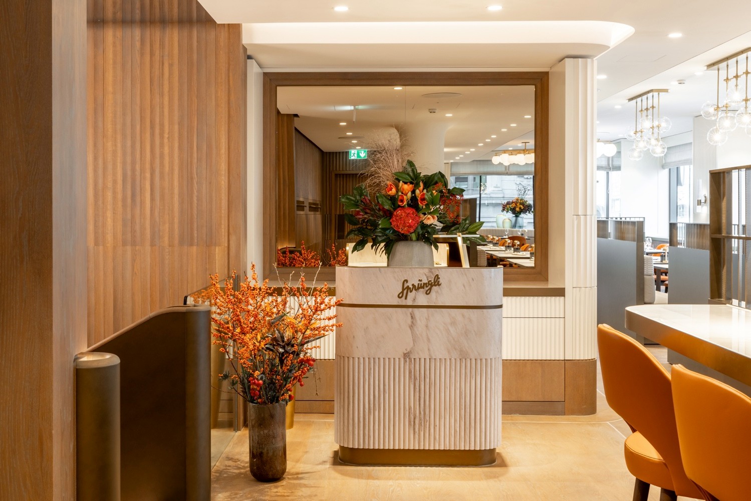 Der Empfang des neuen Cafe & Restaurants Sprüngli am Paradeplatz in Zürich