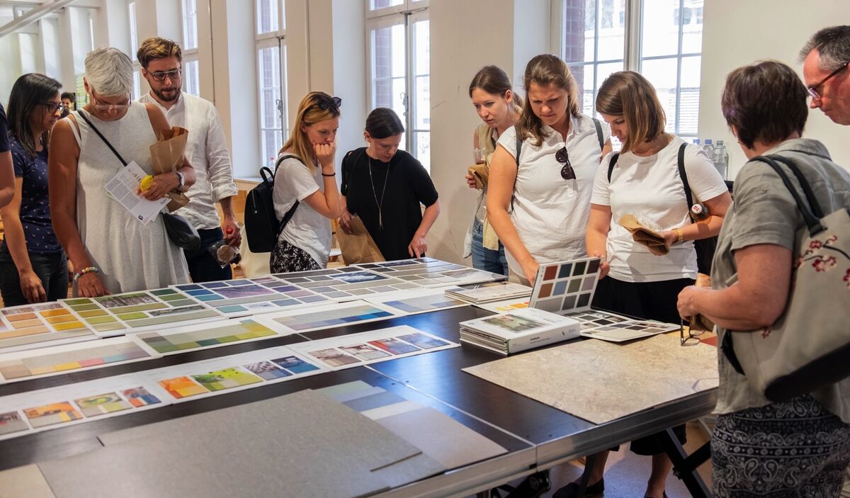 In der Baumuster-Centrale erklärte die Forbo-Chefdesignerin ihre neuste «Marmoleum Marbled»-Kollektion, worauf Nachhaltigkeits-Experte Jörg Lamster erläuterte, was CO2-neutral für das Produkt bedeutet.