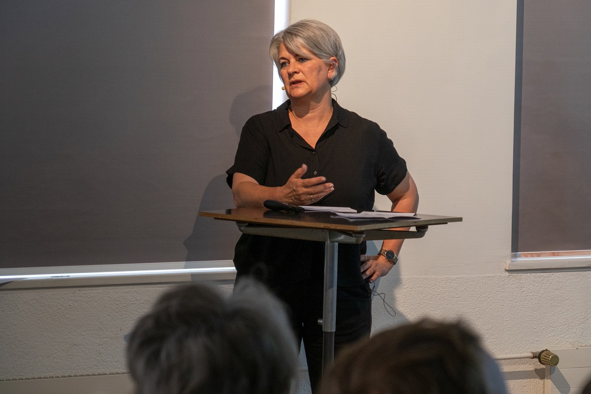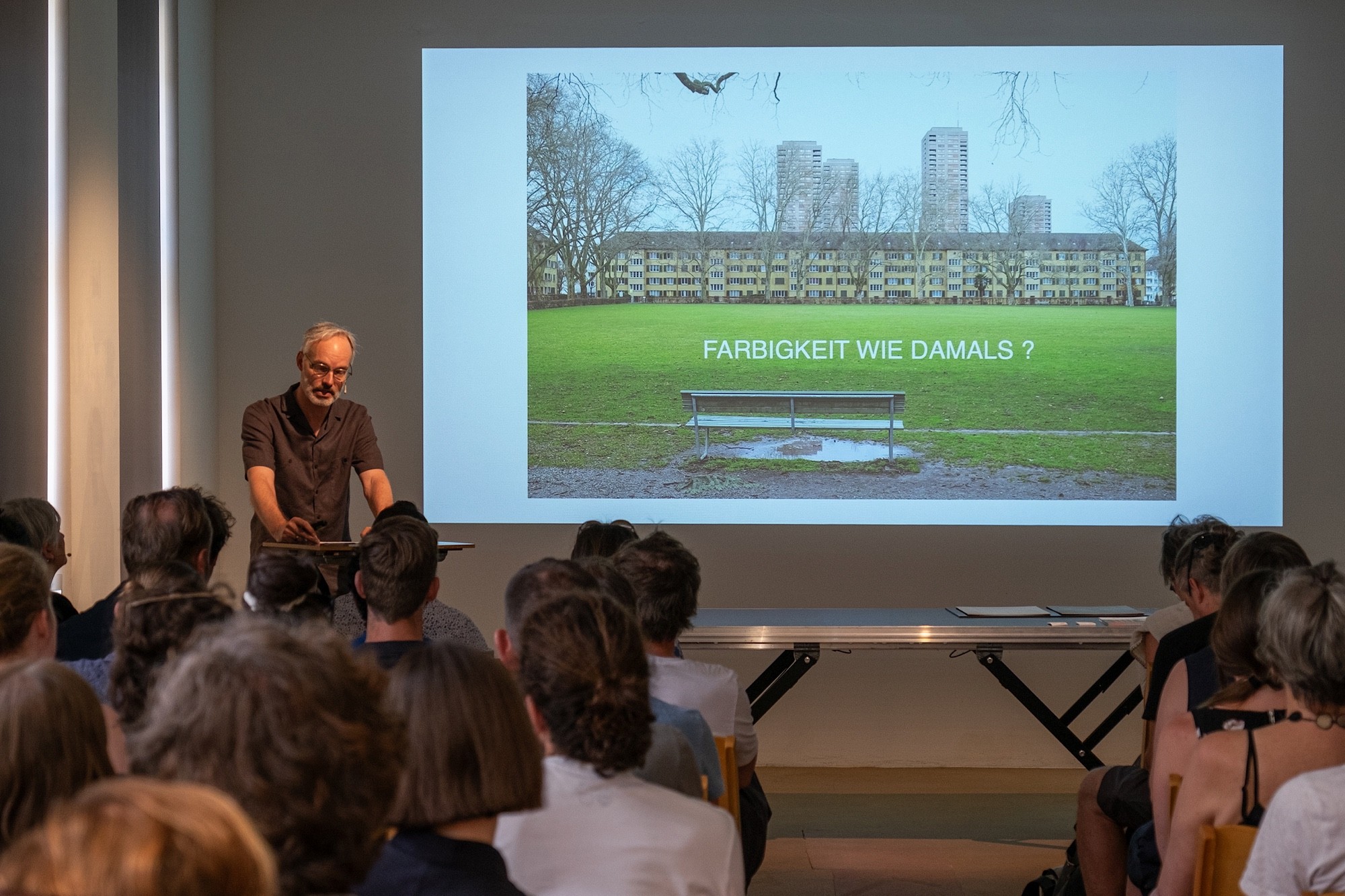 Zuerst zeigt Hauke Möller, wie sich die Situation des Bullingerhofs in Zürichs Stadtentwicklung verändert. 1930 lag er am Stadtrand – mit der erstaunlich vorausschauenden Geste des grossen Innenhofs –, heute ist er Teil der Innenstadt. Die Siedlung entstand in Zeiten grösster Wohnungsnot (sic!) mit geringen finanziellen Mitteln. Es wurde einfach und sparsam gebaut, Verzierungen und Extras gibt es keine. «Das bestimmte unsere Arbeit und machte sie gleichzeitig spannend», meint Möller. Er präsentiert das Material, auf das sich sein Büro für die Sanierung stützte: historische Aufnahmen und Archivbilder, viele davon auch von der ersten Sanierung, die von 1975–79 stattgefunden hat. «Unser Eingriff war minimal», fasst Möller zusammen.
