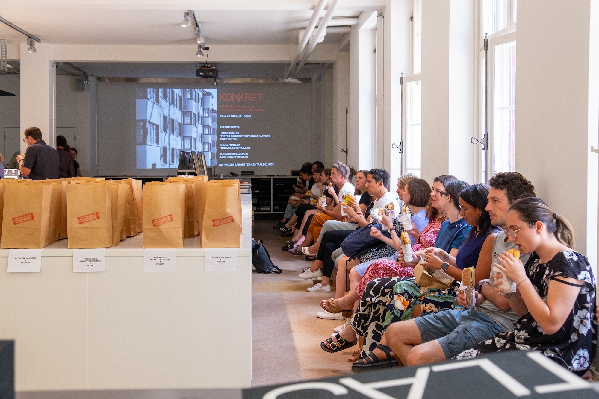 Das vegane Lachssandwich schmeckt nicht nur sehr lecker, die orange Karotte und der grüne Salat leuchten auch bunt aus der braunen Papiertüte, die dem Anlass seinen Namen gibt: Am Brownbag-Lunch in der Schweizer Baumuster-Centrale in Zürich stehen die Farben im Fokus.