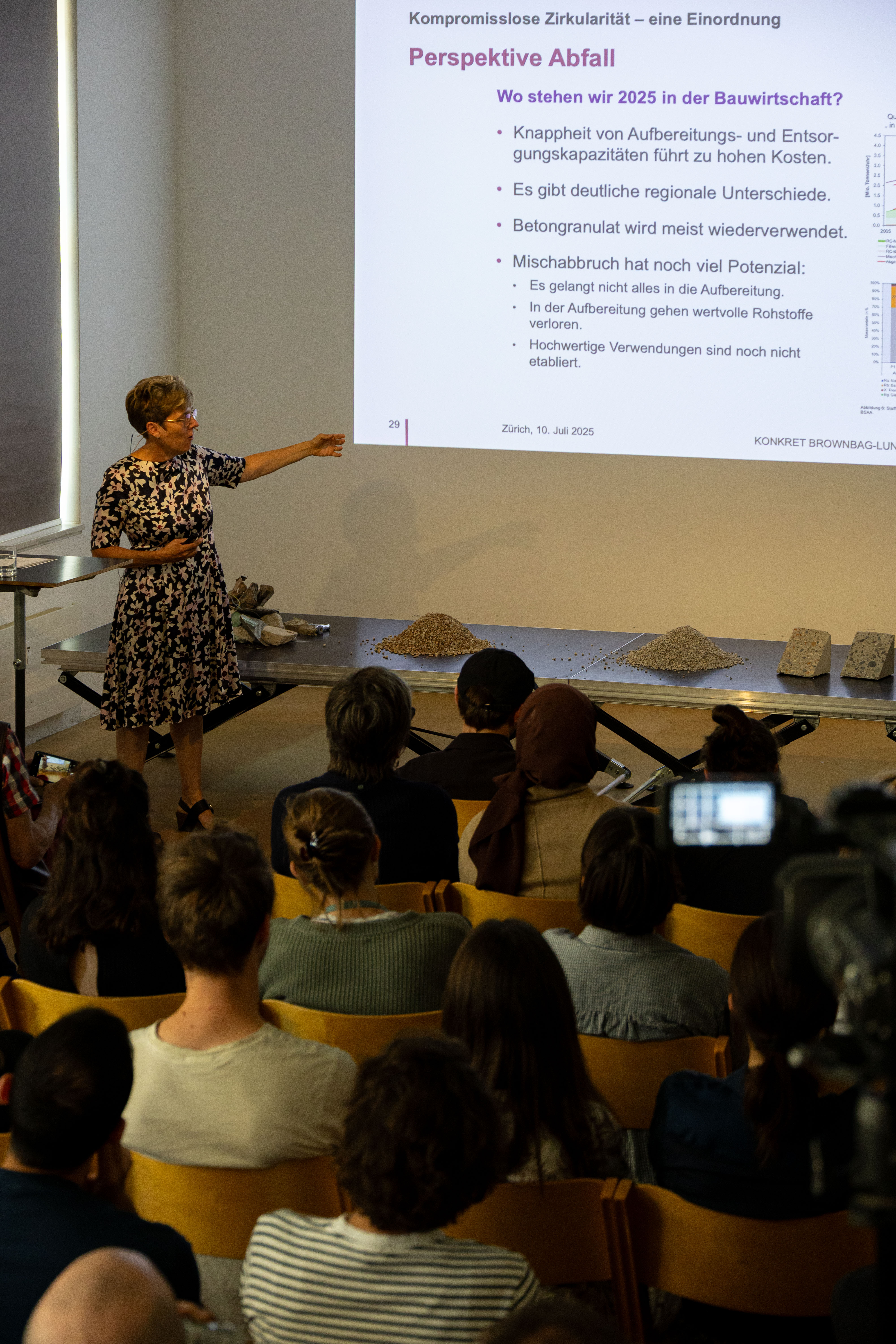 Anschliessend ordnete Susanne Kytzia, Leiterin des Instituts Bau und Umwelt an der Ostschweizer Fachhochschule OST, die Kreislaufwirtschaft bei den Baumaterialien ein. Seit 1986, noch vor der Uno-Umweltkonferenz in Rio 1992, verpflichtet sich die Schweiz mit ihrem Abfallleitbild, die Abfallproblematik im eigenen Land zu lösen. Das wichtigste Element dabei: Das Verursacherprinzip. Das heisst, wer den Güsel macht, muss dafür sorgen, dass er wieder weg kommt. Beim Siedlungsabfall wurde mittlerweile viel erreicht, er wird teilweise direkt recycelt, teilweise verbrannt und zumindest in Energie umgewandelt. Kehrichtdeponien gibt es nicht mehr. Das Abfallproblem hat sich zu den Bauabfällen verlagert. Doch kaum eine Region möchte Deponien dafür eröffnen und Mischabbruch-Beton ist wegen der schlechten Qualität auch keine Lösung. Eigentlich muss die Sortierung bereits beim Abbruch geschehen, damit der Anteil der Kreislaufbaustoffe auf 30 Prozent gesteigert werden kann. Doch momentan ist neu abgebauter Kies noch zu billig, als dass sich Recycling-Kies lohnt. Wenn sich Wege finden lassen, den Bauabfall werterhaltend wieder zu verwenden und dies dazu noch kostengünstig geschieht, reduziert sich der Abfallberg.