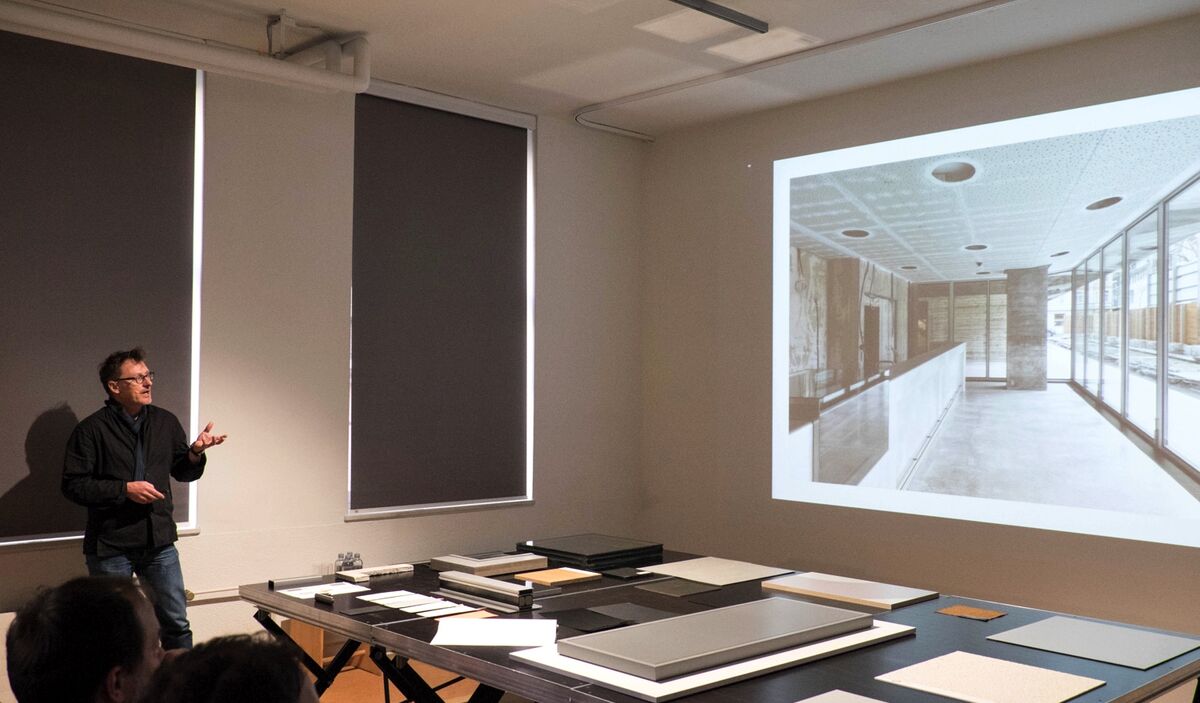 «Das Amtshaus am Helvetiaplatz ist ein sperriges Gebäude», beginnt Michael Widrig von Kaufmann Widrig Architekten seinen Vortrag am Brownbag-Lunch in der Schweizer Baumuster-Centrale: Wuchtige Pfeiler, grobe Betonbrüstungen, endlose Fensterreihen. Technisch war das 1963 eröffnete Haus seiner Zeit voraus, die Architekten Walter, Doebeli + Hoch planten mit vorfabrizierten Elementen, vorgespannten Unterzügen, Aluminiumfenstern. Seit 2013 steht es unter Deckmalschutz. Das stellte die Architekten bei der Sanierung vor Herausforderungen. Um die Fassade nicht zu verändern, dämmten sie innen nach: Eine Schicht Foamglas und eine zweite mit Multipor-Dämmplatten. «Letzterer Schneidet bei der grauen Energie besser ab», sagt Widrig. Das war wichtig, da die Architekten nach Minergie-Eco planten. Sonnenschutzgläser reduzieren den Wärmeeintrag weiter, damit sich das Gebäude im Sommer nicht wie bis anhin auf bis zu 30 Grad aufheizt. Im Winter wärmt eine Bodenheizung, die alten Radiatoren unter den Fenstern sind Akustikpaneelen gewichen. Optisch verändert hat sich nur das Erdgeschoss: Die Architekten ergänzten die beiden Erschliessungskerne um ein Café und einen Empfangsbereich. So bringen sie das schwebende Gebäude auf den Boden, in die Stadt.