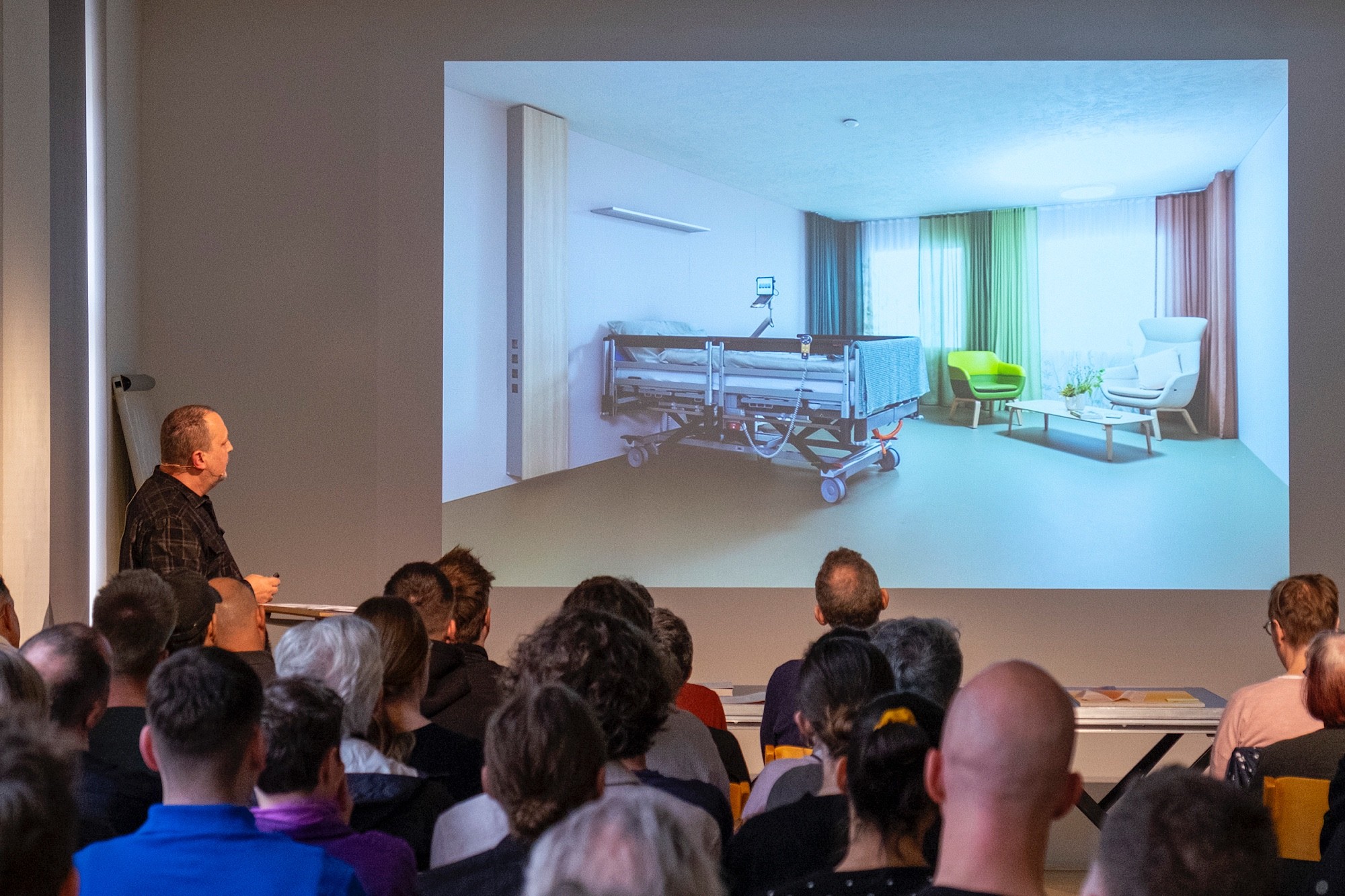 Eine zweite Schnittstelle spielt an der Veranstaltung eine entscheidende Rolle. Jene zwischen Klugs Firma Keimfarben und dem ‹Swiss Center for Design and Health› (SCDH). Das jüngste nationale Technologie- und Kompetenzzentrum forscht zum Thema Architektur und Interior Design im Gesundheitswesen. In Nidau bei Biel betreibt das Zentrum Werkstätten und Musterzimmer, in denen sich die Wirkung von Putzen, Farben und Textilien ausprobieren lassen. Für diese Musterzimmer hat sich das SCDH für den ‹Janus›-Putz entschieden.