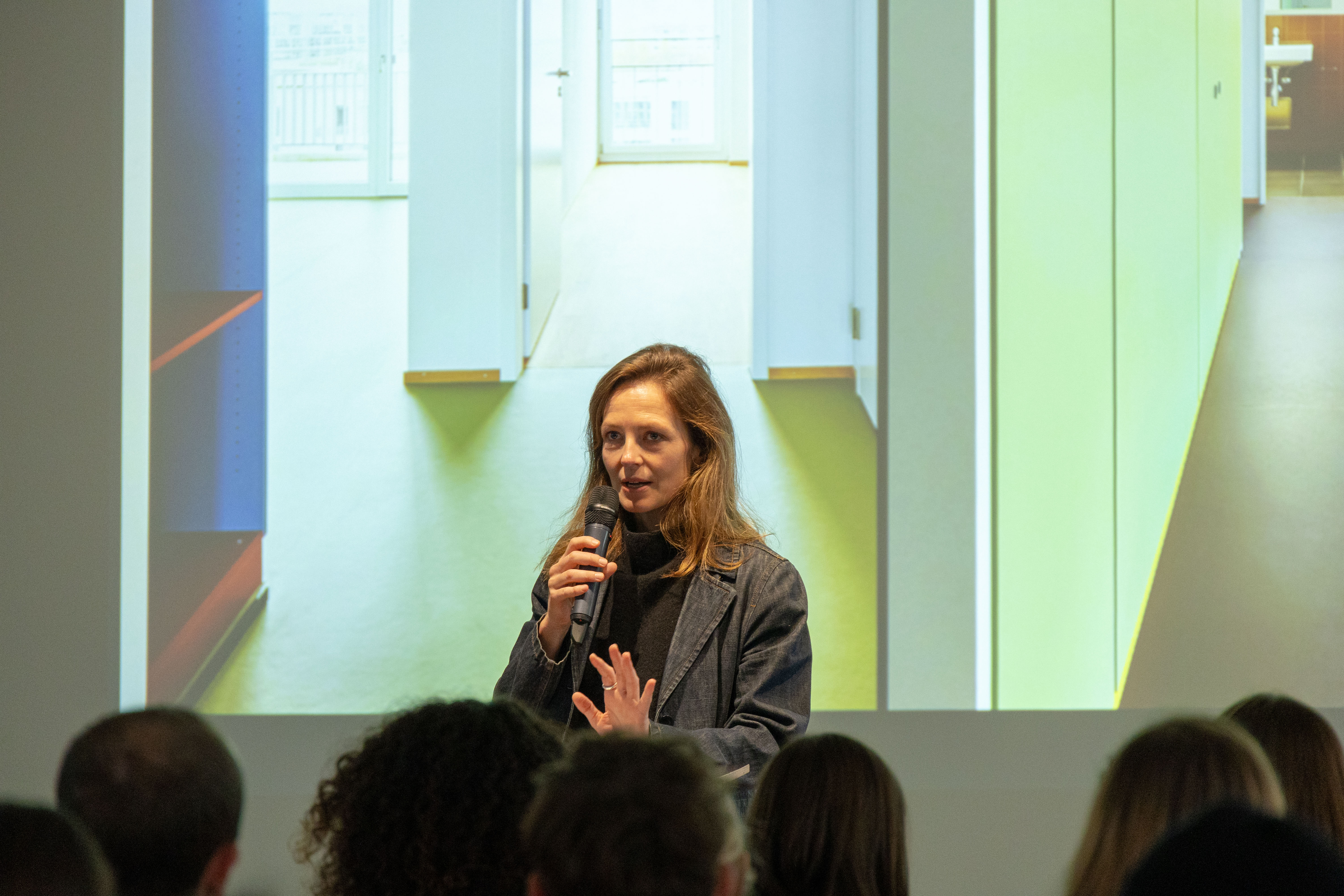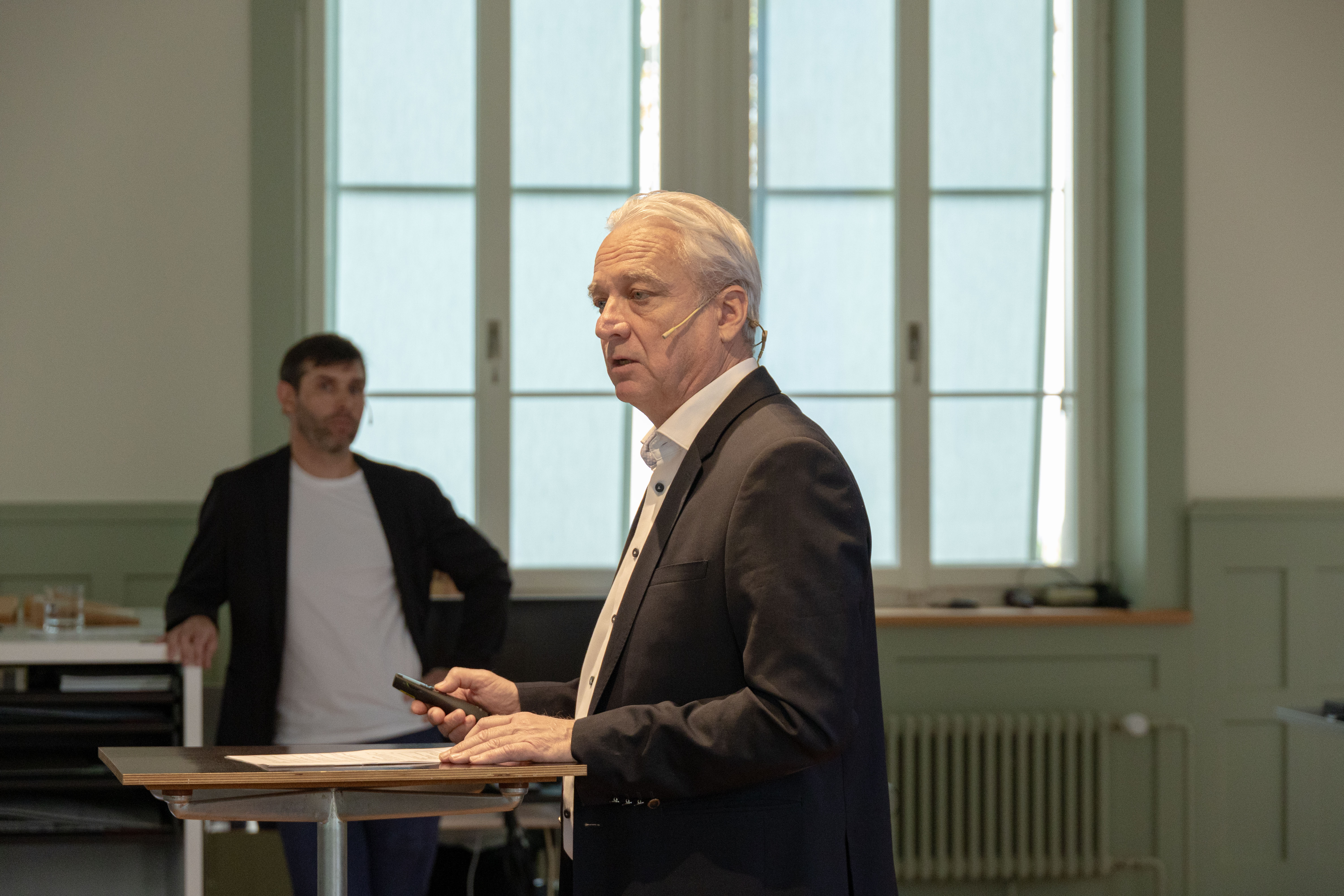 Beim Brownbag-Lunch sprachen Marcel Gmür von Forbo und der Architekt Andreas Feurer von Clou Architekten über den Einfluss von Linoleum auf die Raumwahrnehmung bei der Wohnsiedlung Leutschenbach.