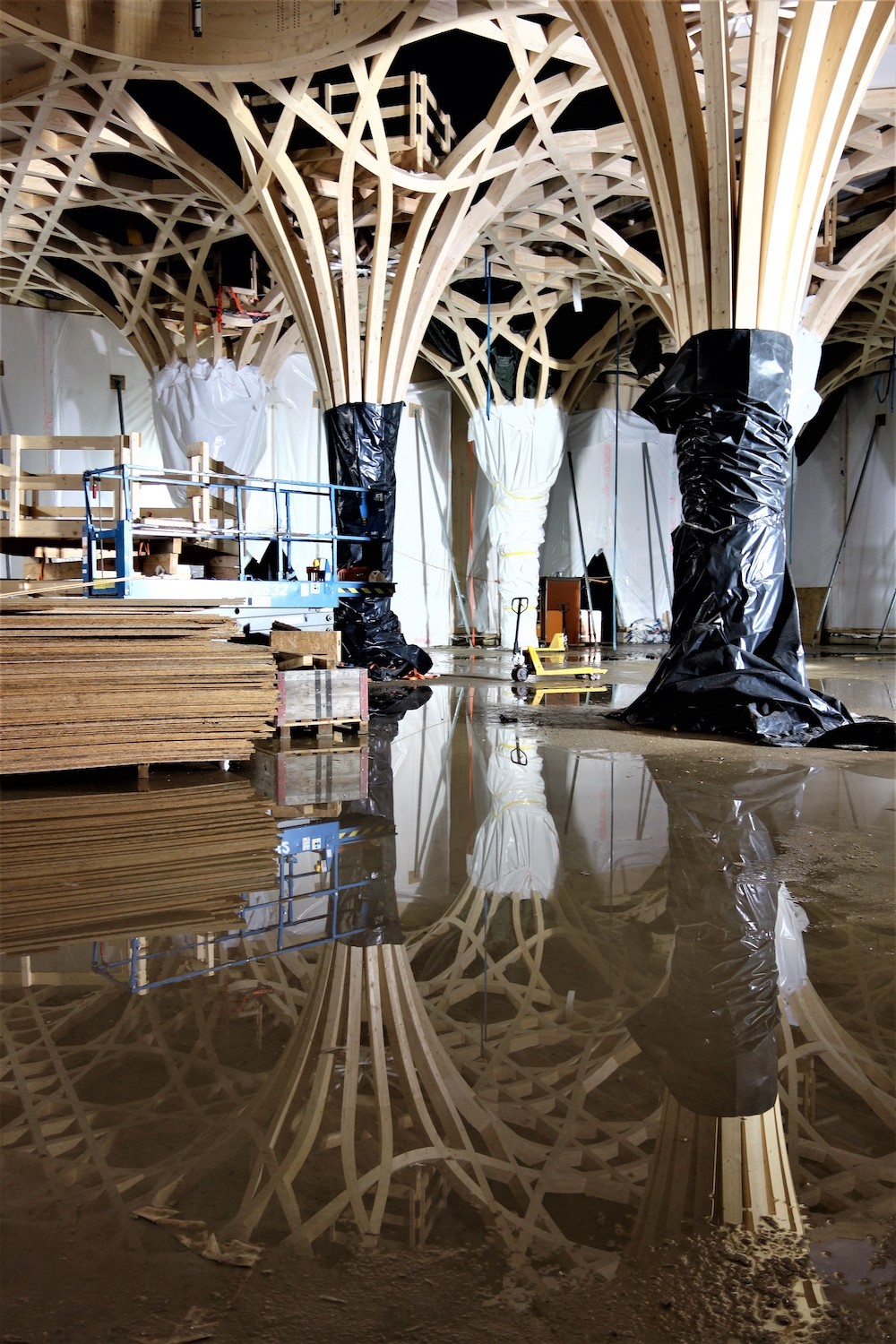 Ein mächtiger Holzträger windet sich durch die vollbesetzten Stuhlreihen und richtet sich vorn auf, wie eine Kobra. Wenn man mit Holz solche Freiformen baue, begrüsst Stefan Baumberger die Gäste in seiner SBCZ, dann lande man früher oder später bei der Firma, die den heutigen Brownbag-Lunch bestreitet, man lande bei Blumer Lehmann. Auf ihrem Erlenhof bei Gossau entstehen seit mehreren Generationen kunstvolle Holzkonstruktionen – am Anfang noch rein handwerklich, heute in Kombination mit neuster digitaler Planung und Fertigungstechnik. Vorgestellt werden heute zwei aktuelle Projekte, darunter die Cambridge Mosque von Marks Barfield Architects mit kunstvollen Stützenbündeln, die sich hoch oben zur elegant geflochtenen Holzdecke auffächern.