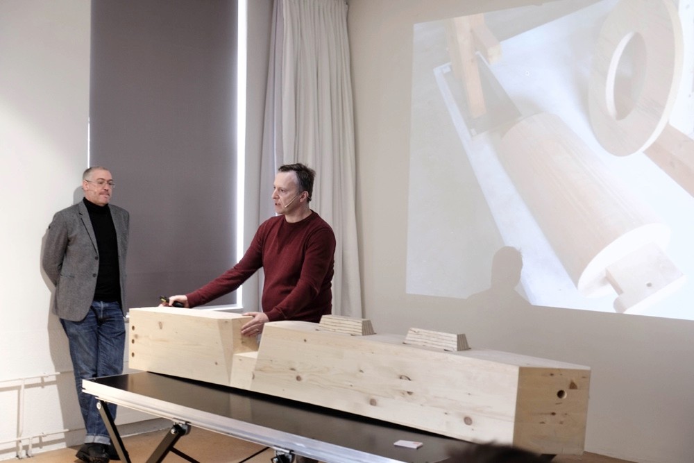 Die Projekte bilden beim Anlass aber nur den Rahmen für etwas anderes, für ein Plädoyer fürs Mock-up. Leidenschaftlich wirbt Kai Strehlke für das 1:1-Modell. Der Architekt und Leiter Digitale Prozesse bei Blumer Lehmann spricht vom «magischen Moment», wenn man erstmals vor dem Bauteil in Originalgrösse steht, lange bevor das dazugehörige Gebäude fertig ist. Bilder der Bündelstütze aus Cambridge geben ihm Recht: die zugehörigen Architekten stehen fotografierend vor dem Bauteil. Und der komplexe, mehrschichtige Aufbau des Holzträgers einer anderen Baustelle vermittelt ohne Worte, warum hier mehrere Mock-ups nötig waren, um so etwas bauen zu können. Der schlängelnde Träger gehört zu einem davon, ein anderes hat die Grösse eines Einfamilienhauses mit zwei Geschossen. Daran probierte der Holzbauer, liess auch den Fassadenbauer ran. Denn, so das Credo Strehlkes: Einen solchen «Piloten» baut man, bevor Ausschreibung und Werkplanung beginnen, auf der Baustelle sei es zu spät. Denn beim freigeformten Holzbau ist ein Mock-up nicht nur dafür da, vor Ort die Erscheinung der Konstruktion zu überprüfen. Er liefert den Architekten, Konstrukteuren und Holzbauern wichtige Erkenntnisse für Geometrie und Konstruktion, Montage und Logistik, Produktion und Kosten. Und, ja, auch zur Ästhetik.