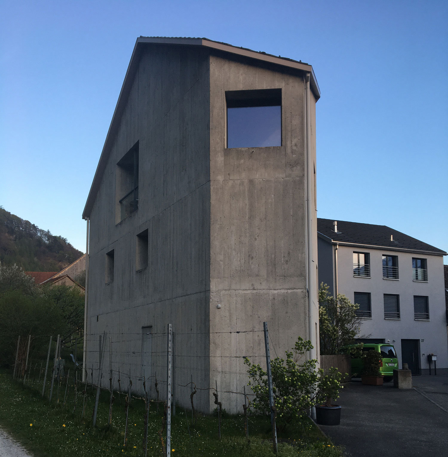 Das Turmwohnen hat eine lange Geschichte in den Bergdörfern. Familien zeigten mit der Höhe ihres Turms ihr gesellschaftliches Gewicht, vor Überfällen zogen sie sich in die Türme zurück und holten die Treppen ein. In Fläsch ist diese Tradition noch jung. 2011 haben die Architekten Bearth & Deplazes für Claudia und Andrea Meuli dieses Haus entworfen. Es gilt heute weitherum im Dorf als eine Perle der Architektur, auf die man stolz ist. Das war anders, als es gebaut werden wollte. Die ästhetischen Aufpasser in der Gemeinde zogen das Türmlein vor den Richter: fremd, falsch, wollen wir nicht. Es ging dann doch. Und als der Heimatschutz Jahre später Fläsch mit dem Wakkerpreis auszeichnete, prangte stolz Meulis Türmlein auf den Botschaften der Ratsstube an die Medien. Heute gehört es zum Dorf wie die ältesten Brunnen. Auch bautechnisch ist das Haus bemerkenswert, gegossen als Monolith aus Beton der Marke Misapor. Der ist versetzt mit Glaskugeln, damit er die energetischen und statischen Anforderungen erfüllen kann. Und der Turm ist gut, weil sein Fussabdruck in der Landschaft klein ist und also sein Garten weit....