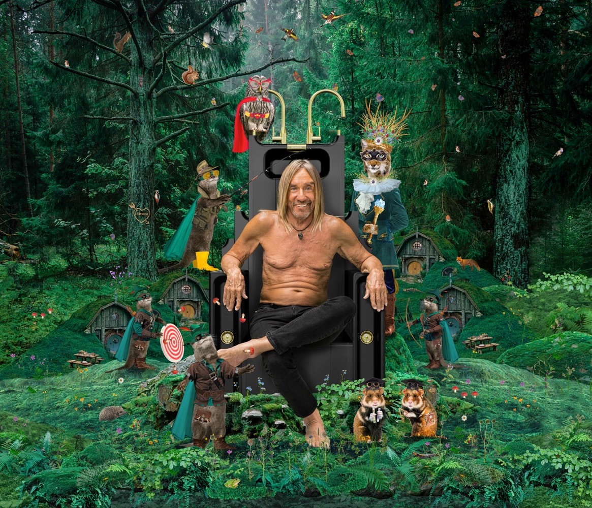 Iggy Pop sitzt auf einem Thron – so weit, so normal. Eher aussergewöhnlich ist, dass dieser Thron aus Küchenkeramik und Armaturen besteht und inmitten eines märchenhaften Waldes steht.