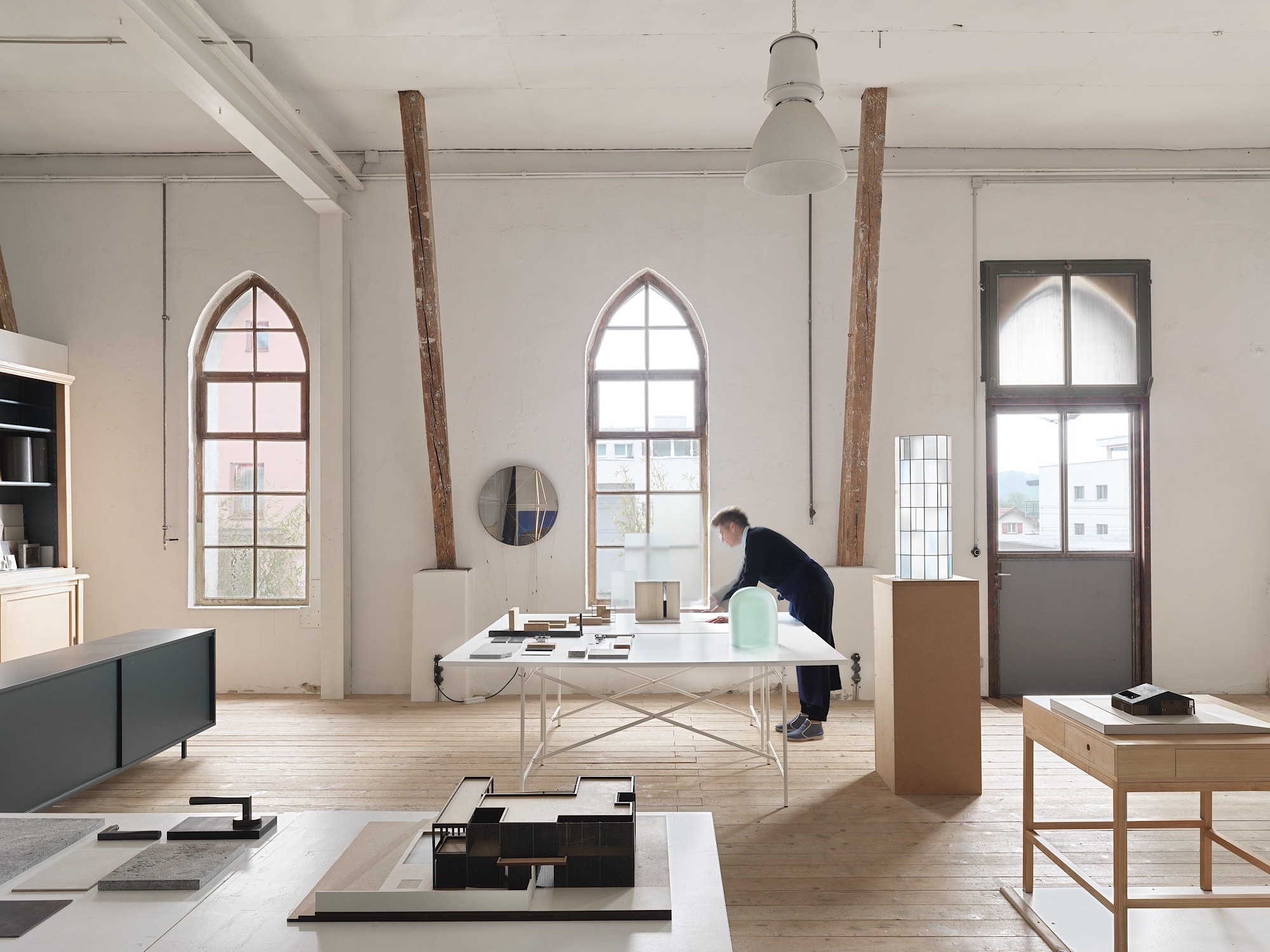 Im Rückblick fällt mir auf, dass die damalige Zusammenarbeit mit Daniela, obwohl wir uns nicht häufig gesehen haben, mich an die unterschiedlichsten Orte geführt hat: nach Venedig, wo es von ihrer Wohnung am Nordrand der Halbinsel auf ein kleines Fischerboot und mit diesem nach Murano in ihre Werkstatt ging; ins Luzerner Hinterland nach Wauwil, wo sie zusammen mit Claudio Holdener eine alte Werkhalle in ein luftiges Kunst- und Architektur-Atelier verwandelt hat; nach London, wo Daniela Schönbächler wenige Schritte hinter den farbig blinkenden Screens des Picadilly Circus ein elegantes Kunst-am-Bau-Projekt realisiert hatte; oder dann nach Edlibach, in ein geschmackvollst umgebautes altes Bauernhaus, wo Daniela Schönbächler und besagter Claudio Holdener, seines Zeichens Architekt und Designer, unter anderem zuhause sind – zumindest momentan. Es ist ja nicht auszuschliessen, dass die beiden wieder weiterziehen. Als «Nomaden» wurden sie letzthin in einer Zeitschrift bezeichnet, und das trifft es wohl ganz gut.