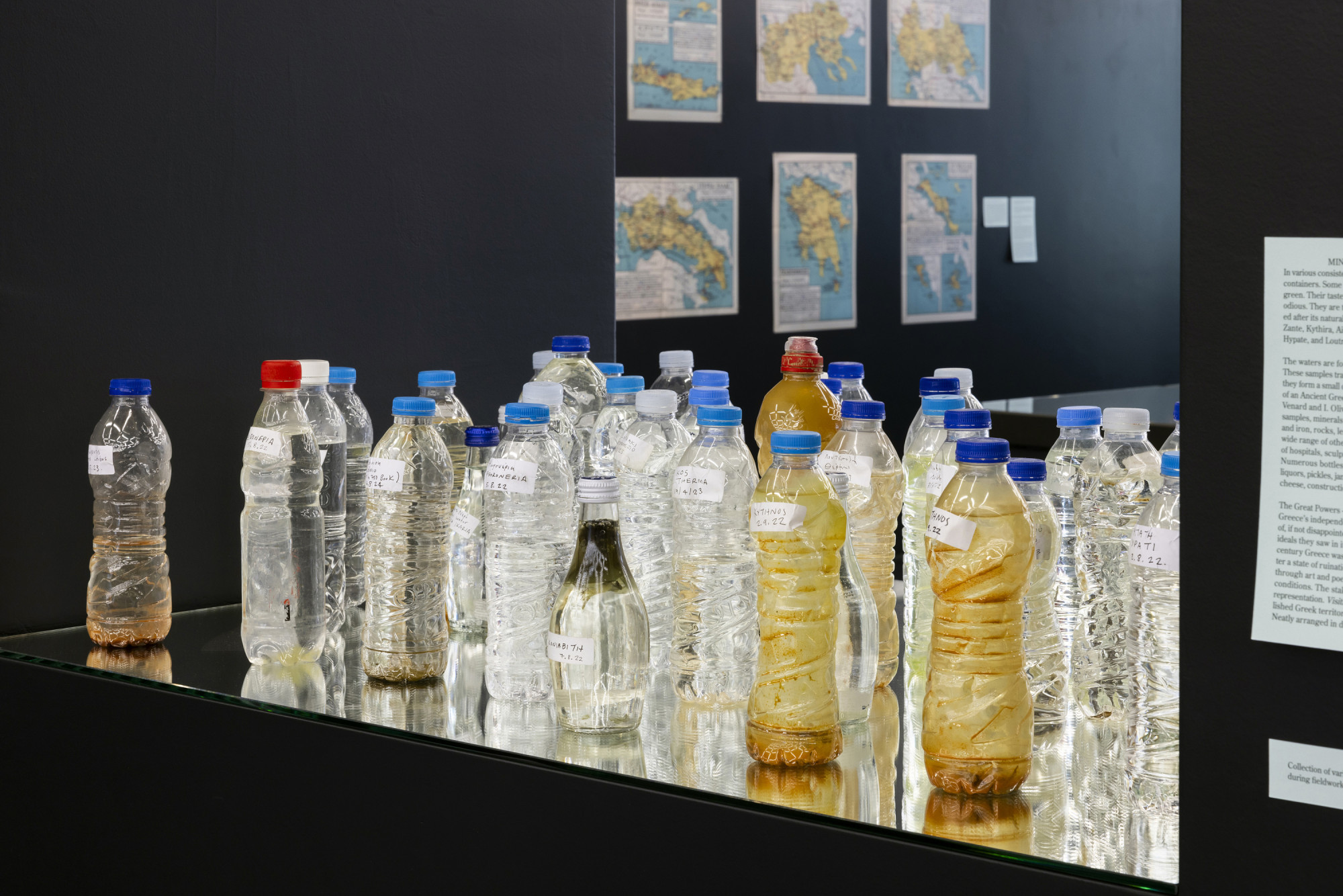 Der Griechische Staat förderte in der Folge den Badetourismus , besonders ab den 1930er Jahren, als viele neue Badeorte (Loutropolen, Bade-Städte) entstanden. Diese wurden bis in jünste Zeit genutzt, stehen neuerdings aber oft leer und harren einer neuen Nutzung. Die Architektin Lydia Xynogala arbeitete im Rahmen ihrer Dissertation am Institut für Geschichte und Theorie der Architektur gta die Geschichte dieser Badeorte auf. Die Ergebnisse der Arbeit sind jetzt zusammen mit künstlerischen Installationen bis zum 6. Dezember im Foyer des HIL auf dem Hönggerberg zu sehen. Mitten im ersten Raum steht ein verkleinertes steinernes Abbild einer Badewanne aus Abfallmarmor. In einer Durchreiche sind in Anlehnung an die Weltausstellung 1878 Flaschen mit Wasserproben zu sehen. Die Atmosphäre eines staatlichen Heilbads aus der Mitte des 20. Jahrhunderts evozieren weisse Monobloc-Stühle ebenso wie absichtlich beiläufig positionierte Badeslipper und Bademäntel. Der zweite Raum ist den historischen Exponate gewidmet. Landkarten zeigen, wo überall Mineralquellen sprudeln, Fotos von verlassenen Badeanlagen zeigen, welches Potential in Griechenland schlummert. Eine Vitrine mit Büchern und Traktaten informiert des Griechischen und Französischen kundige Leserinnen und Leser über die griechische Balneologie.