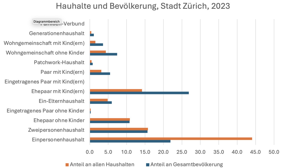 Als Vergleich: 44% der Haushalte der Stadt Zürich bestehen aus nur einer Person. Das entspricht aber nur einem Bevölkerungsanteil von 22% der Gesamtbevölkerung. Seit 2013 hat sich dies übrigens nicht wesentlich geändert, es ist sogar eher eine leichte Zunahme bei den Familienhaushalten festzustellen.