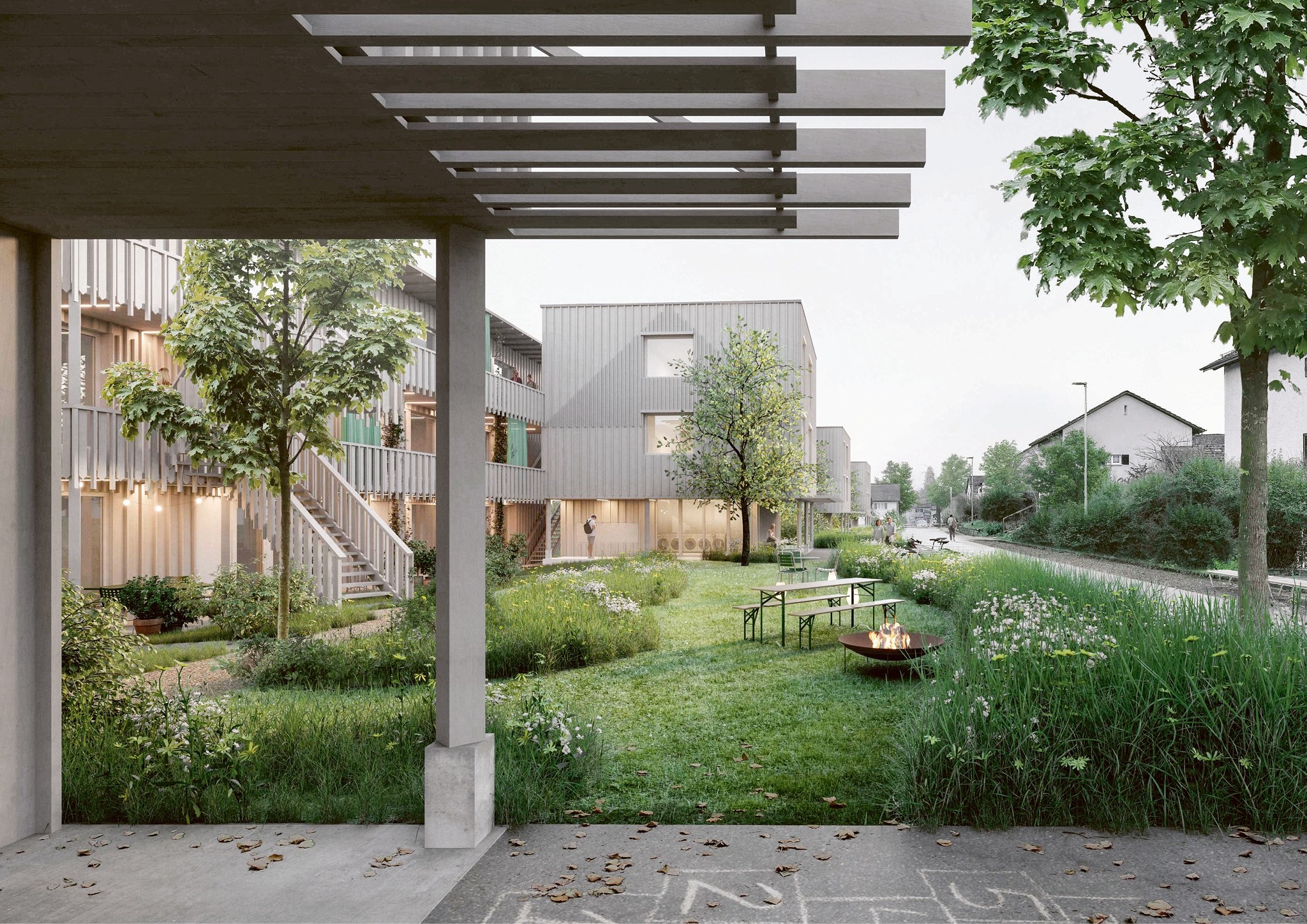 Die Siedlung Grabenacker in Oberwinterthur wurde ab 1945 als genossenschaftliche Antwort auf die Wohnungsnot gebaut. 85 einfache Reihenhäuser bilden das heute denkmalgeschützte Ensemble. Die HGW Heimstätten-Genossenschaft Winterthur erneuert die Siedlung schrittweise und schafft mit rund 130 Ersatzneubauwohnungen zusätzlichen Raum für unterschiedliche Lebensphasen und Haushaltsformen – und bewahrt dabei die Siedlung als zusammenhängendes Ganzes. Die Neubauten gruppieren sich um einen neuen Quartierplatz mit Gemeinschaftsraum und Kiosk. Sie sind in Holz- oder Holzhybridbauweise geplant. Das Wohnungsangebot umfasst Studios, hindernisfreie 2½- bis 5½-Zimmer-Wohnungen, Atelierwohnungen und Mikro-Co-Living-Einheiten. Die Erneuerung führt das Bestehende weiter: in Struktur und Massstab, in Materialwahl und Erschliessung sowie in der Idee eines nachbarschaftlich geprägten Wohnens. Grundlage für das Projekt war ein breit angelegter Masterplanprozess, der 2022 in den privaten Gestaltungsplan ‹Siedlung Grabenacker› mündete. Der Studienauftrag 2024 richtete sich an interdisziplinäre Teams aus Architektur, Landschaftsarchitektur und Soziologie. Auf der Basis des Sieger- projekts wird zurzeit das Vorprojekt erarbeitet. Die ersten sanierten Reihenhäuser sind seit Anfang 2025 wieder bewohnt, der Abschluss ist für 2029 geplant. Die Neubauten sollen gestaffelt ab etwa 2030 bezugsbereit sein.