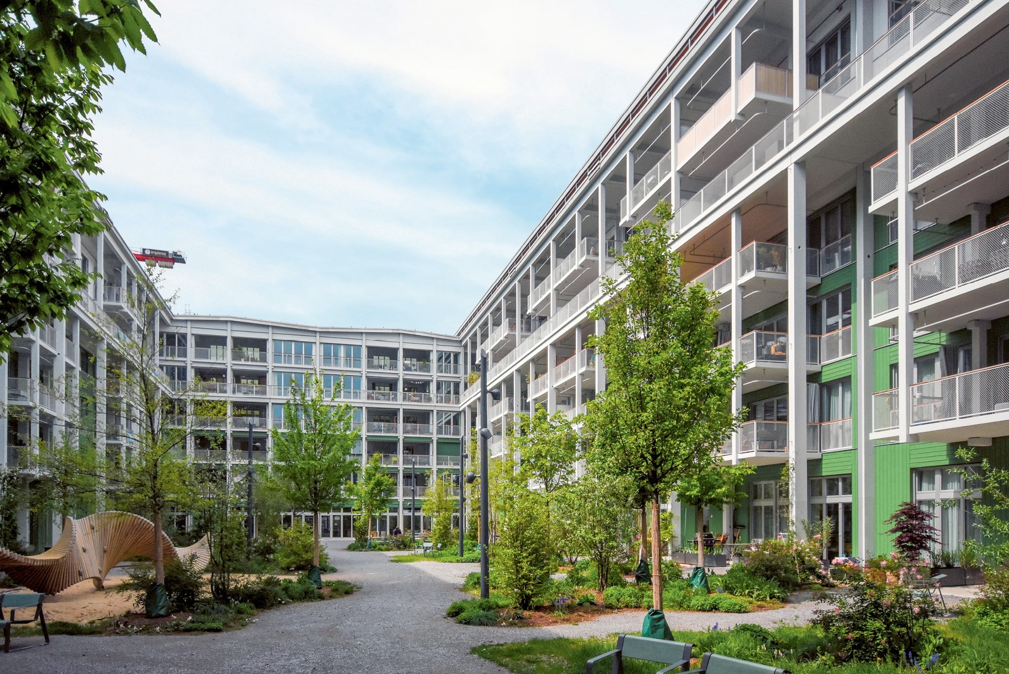 So viel Holz wie hier wurde noch in kaum einem Gebäude in der Schweiz verbaut. Doch zu sehen ist davon zunächst nichts. 160 × 65 Meter misst der Blockrand. Die Grossform steht in der Tradition der wuchtigen Hallenvolumen auf dem Areal. Auch die Fassaden nehmen industrielle Themen auf: Über dem vierten Geschoss wechselt das Material von Faserzement zu Blechschindeln. Nach aussen sind die Fassaden glatt, die Fenster lösen sich in einem Netz aus Aluminium auf. Das täuscht nicht nur über den Holzbau hinweg, sondern überspielt auch die komplexe Bauherrschaft. Zwei Genossenschaften und die Anlagestiftung Adimora der Pensimo-Gruppe erstellten Mietwohnungen, Implenia verkaufte Eigentumswohnungen. Läden und Gewerbeflächen im Erdgeschoss tragen zur Nutzungsmischung bei. Der Hof gibt dem Ganzen eine Mitte. Hier wird das Holz sichtbar, das hinter der Fassade trägt. Der Holzbau definierte den Rhythmus der Betonstützen. Um Helligkeit in den tiefen Baukörper zu bringen, erweiterten die Architekten die Erschliessung zu Lichthöfen. Wer die Wohnungen betritt, sieht immer noch kein Holz, denn es ist farbig gestrichen. Doch räumlich, als zonierendes Element, spürt man es dafür umso mehr.