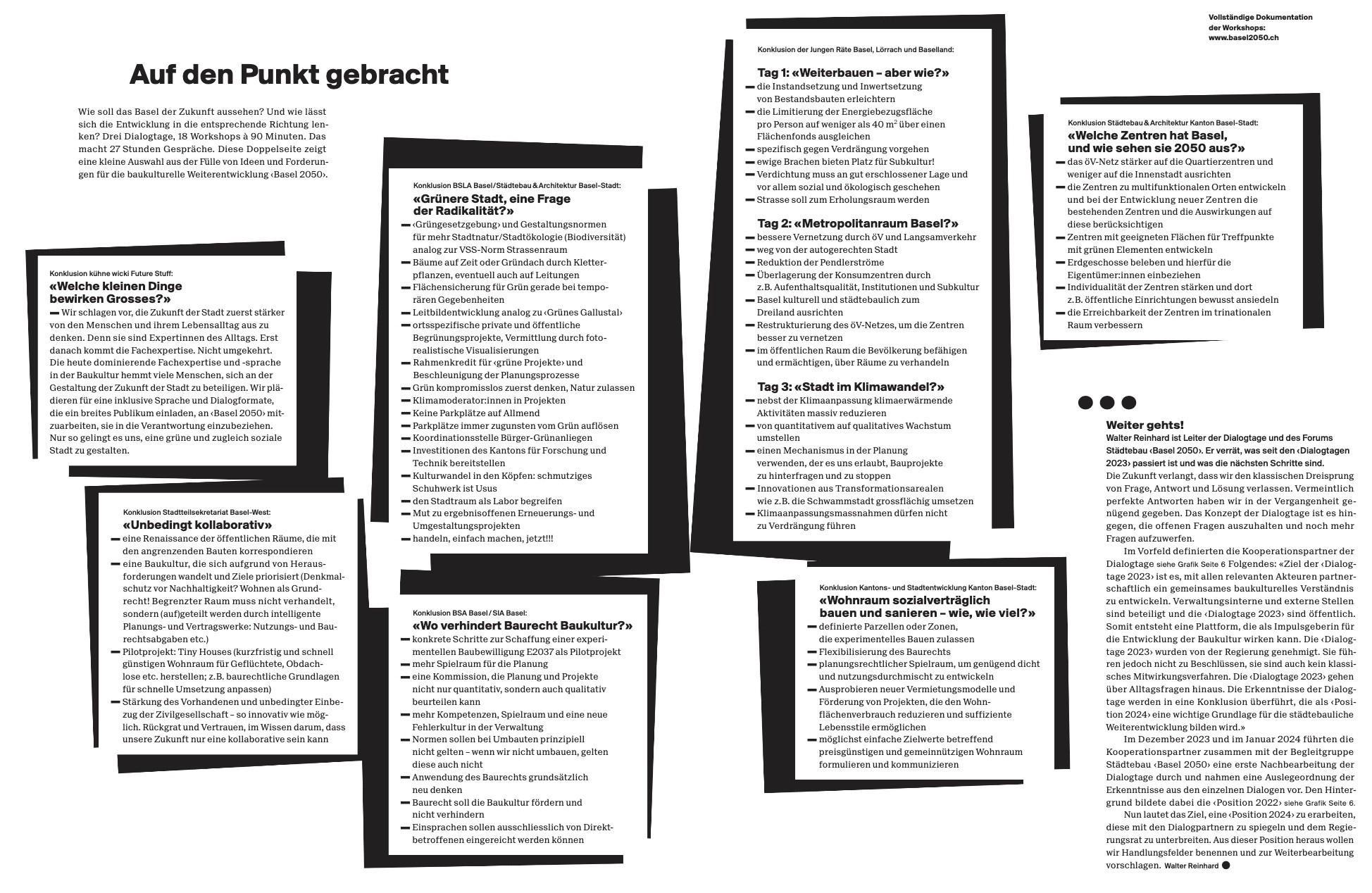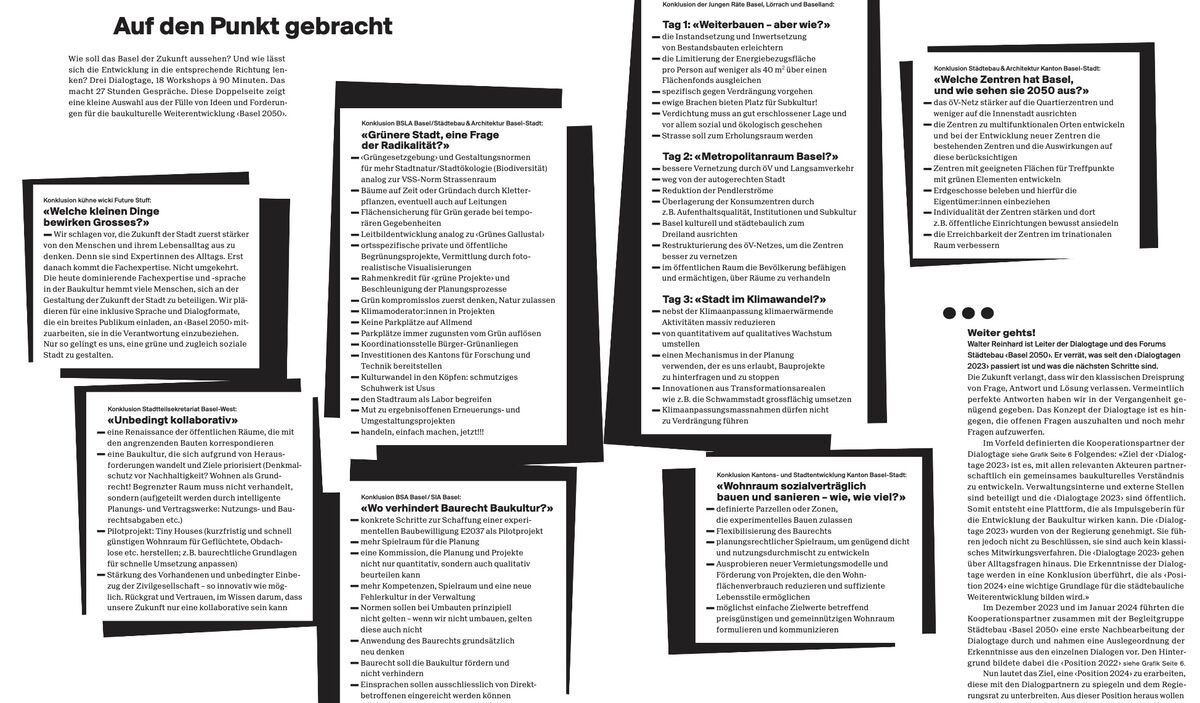 Im Dezember 2023 und im Januar 2024 führten die Kooperationspartner zusammen mit der Begleitgruppe Städtebau ‹Basel 2050› eine erste Nachbearbeitung der Dialogtage durch und nahmen eine Auslegeordnung der Erkenntnisse aus den einzelnen Dialogen vor. Den Hintergrund bildete dabei die ‹Position 2022› siehe Grafik Seite 6.