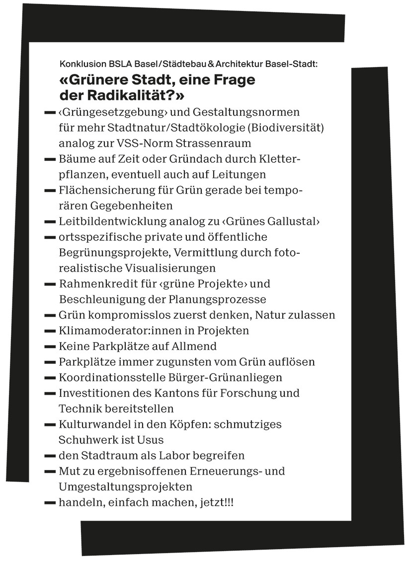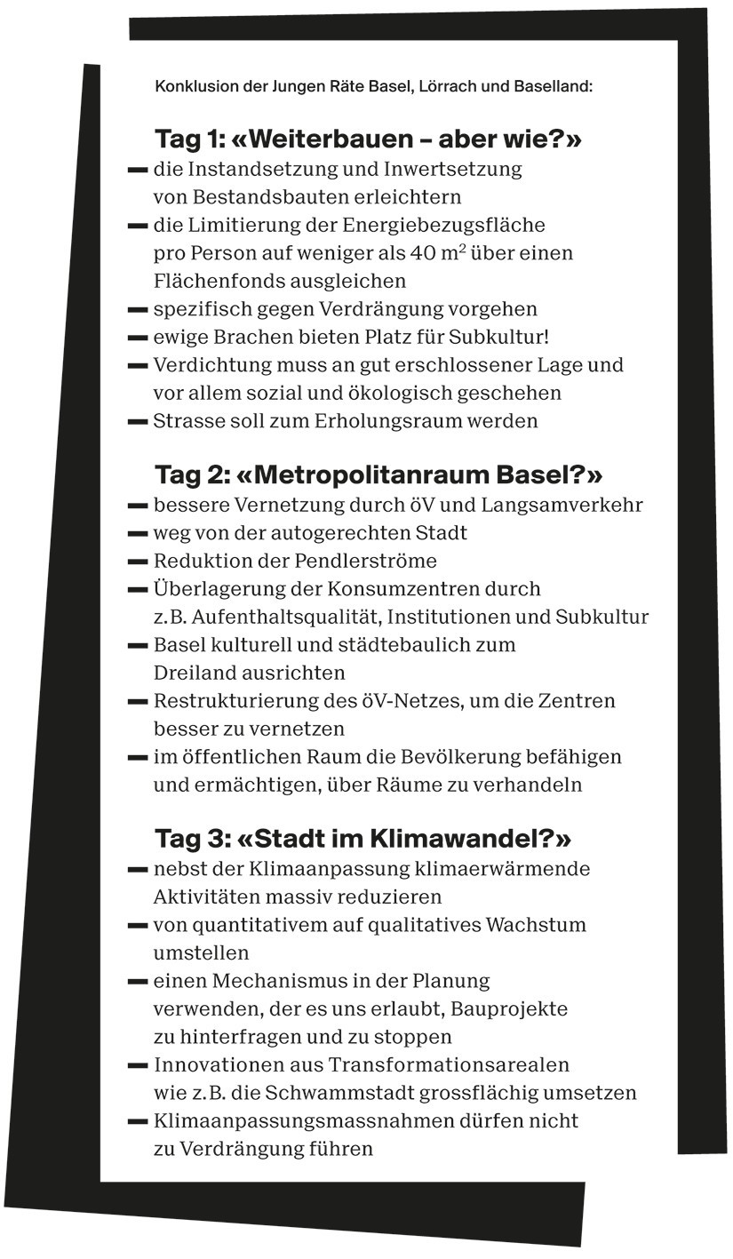 Die Leiterinnen der Workshops haben die Ergebnisse protokolliert und anschliessend in «Konklusionen» zusammengefasst. Hochparterre hat für diese Seite eine kleine Auswahl getroffen.