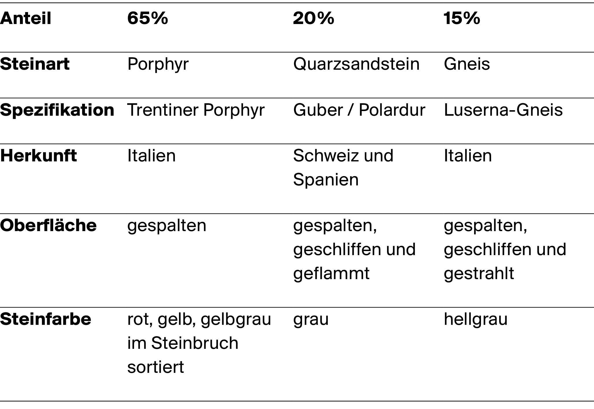 Drei Steinsorten und sechs Steinfarben wurden gewählt, in einem Farbverlauf von Grau über Gelb zu Rot. Die Auswahl der Steine war ein anspruchsvoller Prozess. An oberster Stelle stand das Prinzip, mit möglichst lokalen und wiederverwendeten Materialien zu bauen. Hier mussten dann einige Kompromisse eingegangen werden. Der Grossteil der verbauten Steine stammt aus Norditalien, was aber immer noch innerhalb des angepeilten Radius der Materialherkunft von 500 Kilometern liegt. Die Auswahl der Steine ist auch eine ästhetische und praktische Frage. Zur Bemusterung und Beurteilung der Steinfarben und -strukturen wurde ein Mock-up gebaut, das auch klärte, welche Steine sich für ein rollstuhltaugliches Pflaster eignen. Durch geschickte Steinwahl ist es nur bei wenigen Steinen nötig, abzuschleifen, damit sie angenehm zu befahren sind, weil die Spaltflächen glatt genug sind.