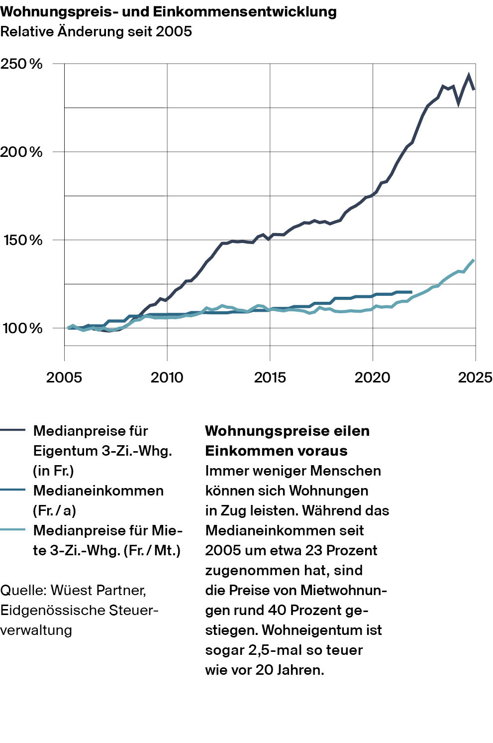 Eine bezahlbare Wohnung zu finden, ist im ganzen Kanton schwierig. Seit 1992 spricht der Kanton Beiträge an meist gemeinnützige Bauträger zur Unterstützung finanzschwacher Haushalte. 2000 trat das Wohnförderungsgesetz in Kraft. 2013 verabschiedete der Zuger Kantonsrat im Richtplan Grundsätze zur Wohnpolitik für Kanton und Gemeinden. 2023 hat der Regierungsrat in der ‹Wohnpolitischen Strategie 2030› drei Ziele festgehalten: mehr Wohnungen generell, mehr preisgünstige Wohnungen und mehr Wohnungen für die ansässige Bevölkerung. Gewisse Ursachen der Wohnungsnot wie die Tiefsteuerpolitik oder den Arbeitsplatzüberhang will der Kanton explizit nicht angehen. Stattdessen sollen vereinfachte Bauvorschriften, beschleunigte Baubewilligungsprozesse und eine Stärkung der Subjekthilfe die Situation auf dem Wohnungsmarkt entschärfen. Zudem sollen gemeinnützige Bauträgerschaften einfacher zu Darlehen kommen. Kürzlich an der Urne gescheitert ist die kantonale ‹Mehrwert-Initiative› der SP, die eine zwingende Mehrwertabgabe von 30 Prozent bei Um- und Aufzonungen sowie bei Bebauungsplänen vorsah, um damit auch preisgünstigen Wohnraum zu finanzieren.