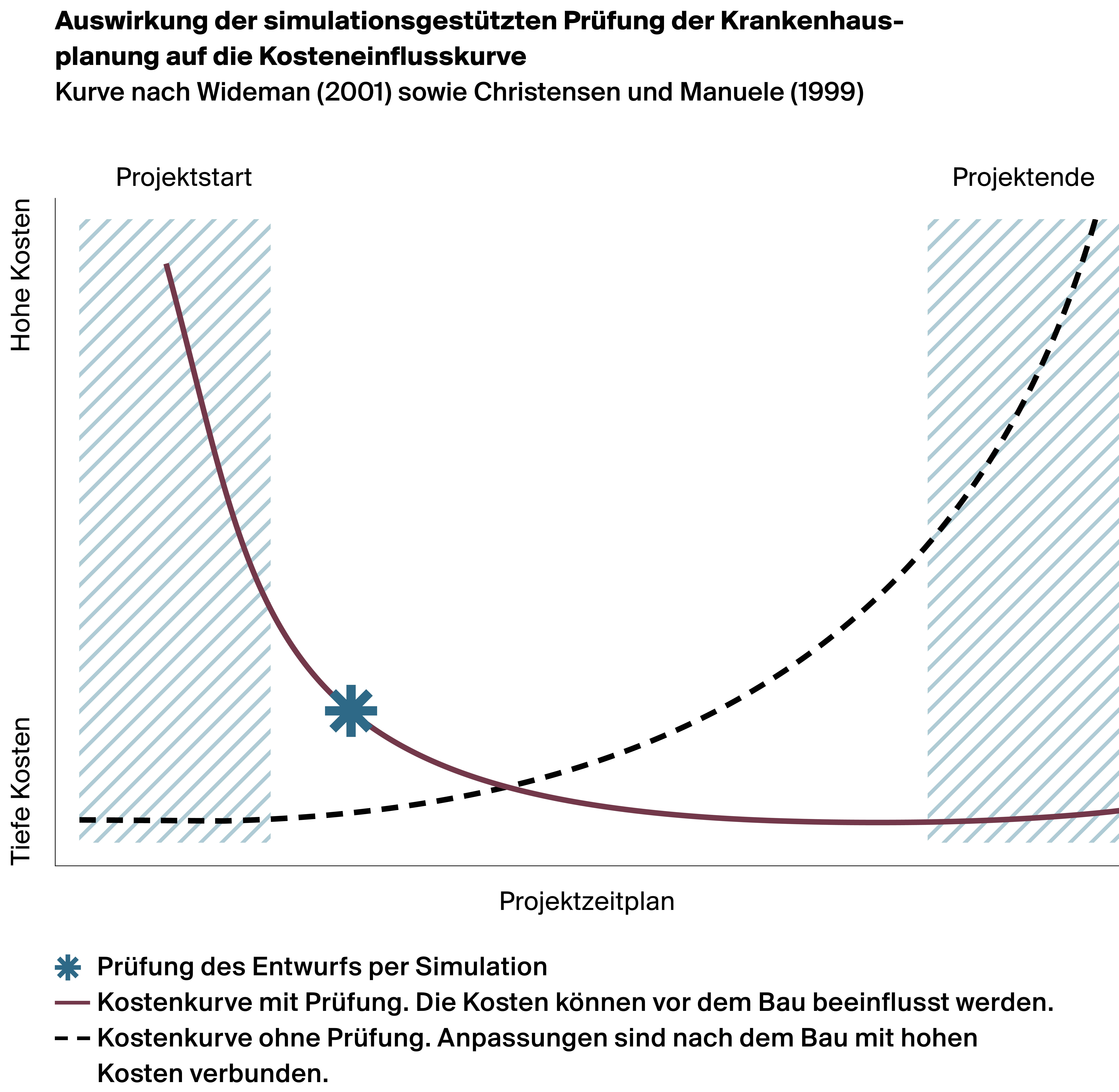 Wir verwenden ein Konzept namens Kosten-Einfluss-Kurve. Dieses zeigt, wie kostengünstig Änderungen in der frühen Planungsphase sind, während sie nach Beginn des Baus viel teurer werden. In einem Fall musste eine Notaufnahme komplett umgebaut werden, was Millionen gekostet hat. Mit Simulationen kann man solche Probleme frühzeitig erkennen und so sowohl Bau- als auch Betriebskosten langfristig einsparen.