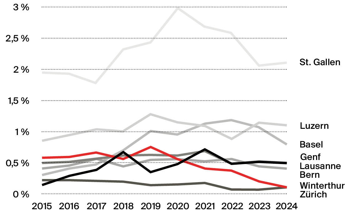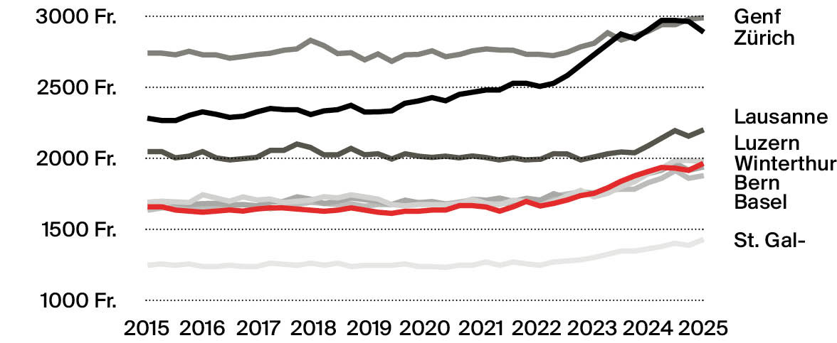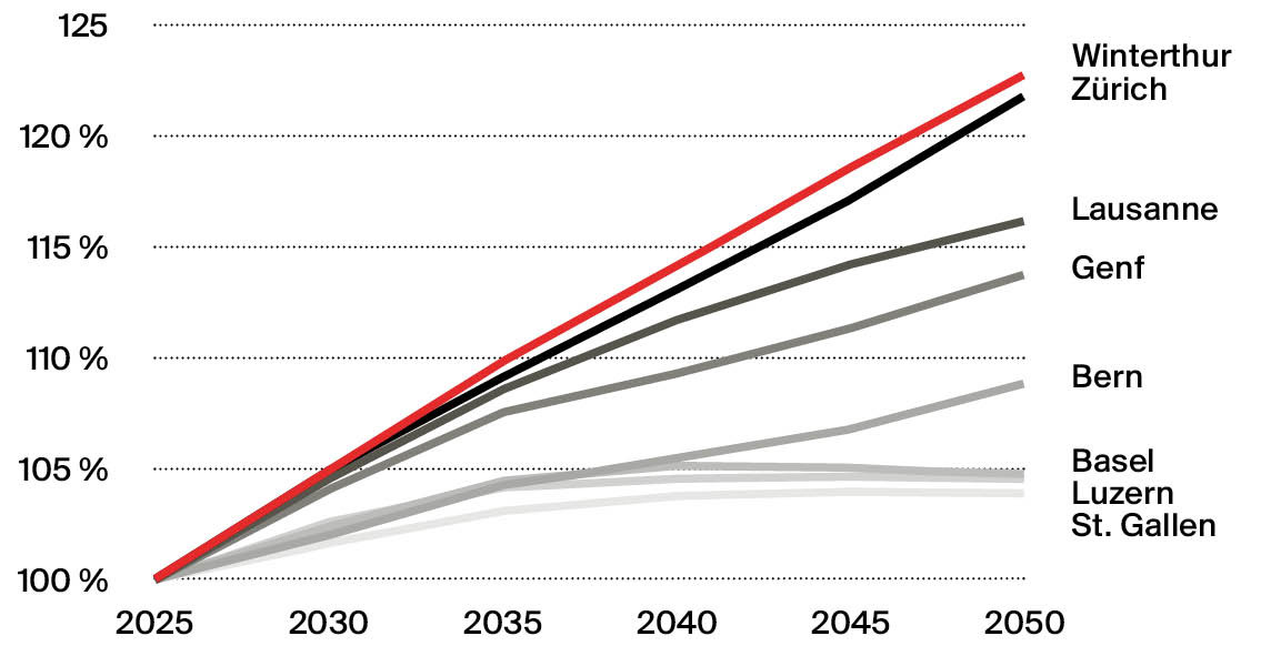 Bis 2050 könnte Winterthur um weitere 30 000 Menschen auf rund 150 000 Einwohnerinnen und Einwohner anwachsen – so viele, wie heute in Lausanne als der viertgrössten Stadt der Schweiz leben. Doch die Platzreserven sind begrenzt, und mit einer Leerstandsquote von 0,1 Prozent ist der Wohnungsmarkt in Winterthur schon heute ähnlich angespannt wie in Zürich. Auch die Mieten steigen: um 10 Prozent allein in den vergangenen zwei Jahren und damit ebenso schnell wie in Zürich – wenn auch auf tieferem Niveau. Mit einer mittleren Angebotsmiete von rund 270 Franken pro Quadratmeter und Jahr liegt Winterthur heute auf dem Niveau von Basel, Bern und Luzern. Das ergibt eine monatliche Nettomiete von rund 1900 Franken für eine durchschnittliche 3-Zimmer-Wohnung. Das ist zwar rund ein Drittel weniger als in Zürich. Doch wie werden sich die Preise angesichts des prognostizierten Bevölkerungswachstums weiter entwickeln? Entscheidend wird sein, ob das Wohnungsangebot mit der Entwicklung der Nachfrage mithalten kann.