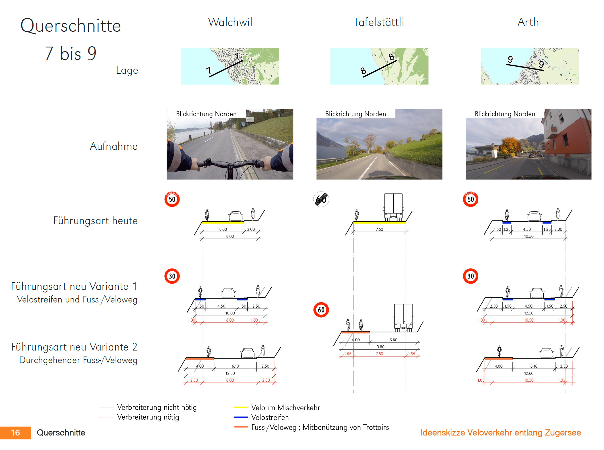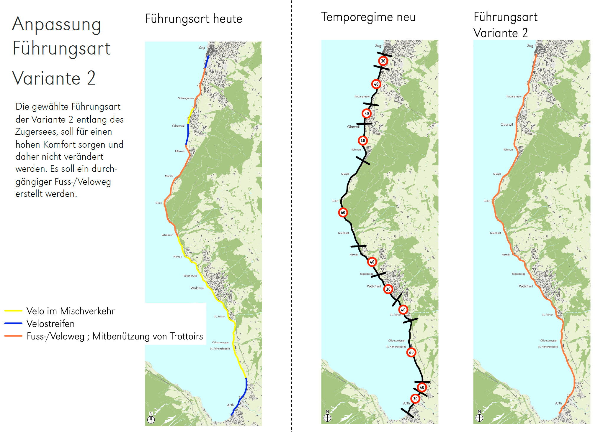 Victor Zoller, Co-Präsident von Pro Velo Zug, kennt die Sorgen: «Die Strecke ist schon ewig ein Thema. Die «Gümmeler» lassen sich von den gefährlichen Engstellen nicht abhalten, die Rundtour um den Zugersee ist als Trainingsroute beliebt. Zwischen Arth und Immensee nimmt der Verkehr ab, und von Immensee über Cham nach Zug ist die Fahrt ein Traum». Grosses Potenzial sieht er für das Freizeitfahren und vor allem für den Pendelverkehr. «Im Ballungsraum Walchwil und im Kanton Schwyz steigt die Siedlungsdichte. Für den Alltagsveloverkehr sind die nur gerade gut 15 Kilometer von Arth nach Zug darum interessant.» Mit einem schnellen E-Bike wäre die Strecke bei guten Bedingungen in rund 20 Minuten zu schaffen. Eine ideale Strecke also für eine vorbildliche Velonetzplanung?