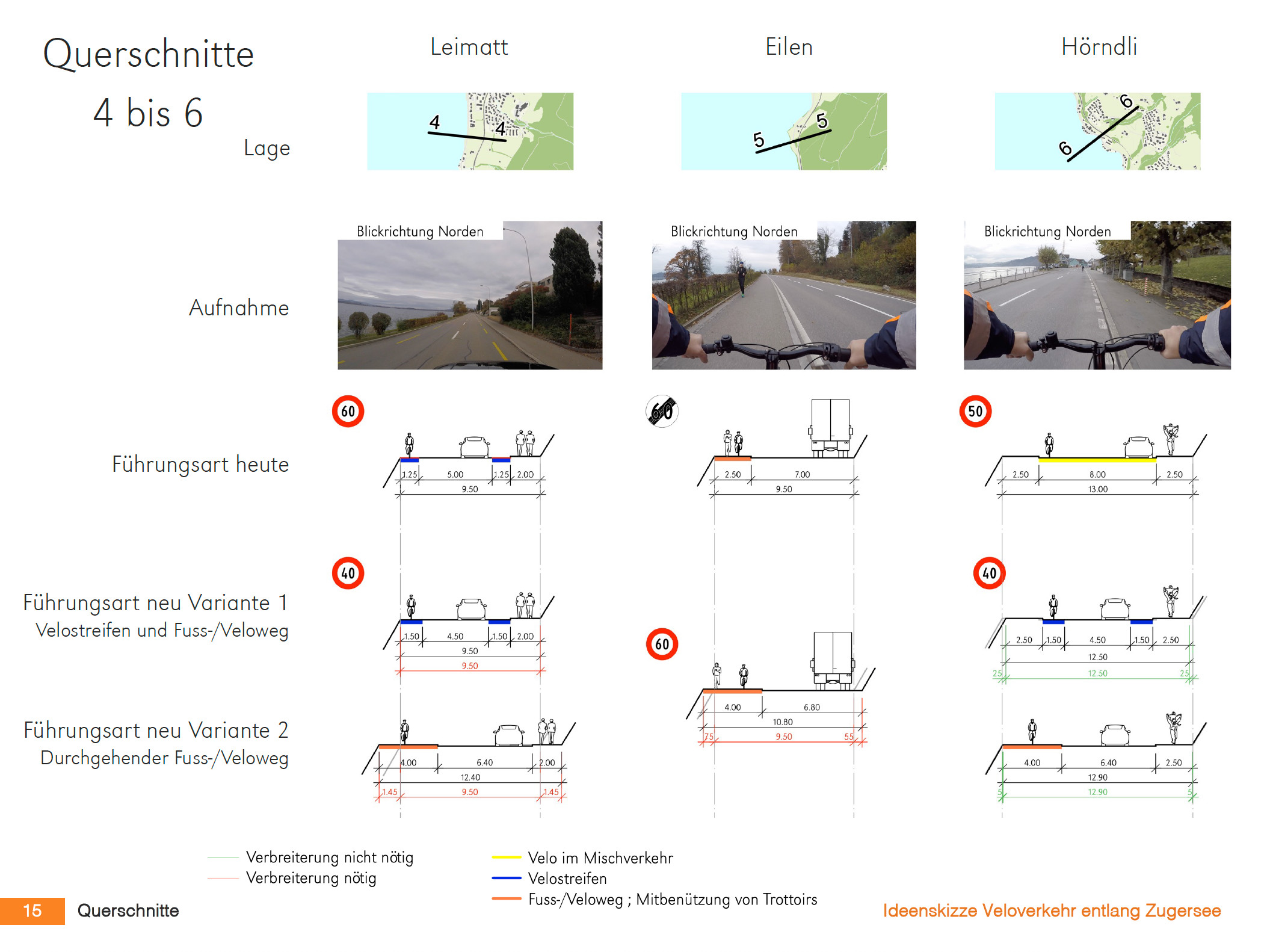 Dass die Strasse heutigen Geschwindigkeits- und Platzansprüchen nicht mehr genügt, zeigt auch die Analyse in der «Ideenskizze Veloverkehr entlang Zugersee, Stadt Zug bis Gemeinde Arth», die das Büro TEAMverkehr.zug 2022 erarbeitet hat. Querschnitte der Strecke illustrieren, wie viel Platz für das Velo bleibt – es ist nicht viel. Mit Ausnahme eines über drei Meter breiten Trottoirs zur Mitbenützung für den Veloverkehr am südlichen Zuger Stadtausgang sind es bestenfalls Velowege von 1,25 Metern in beiden Richtungen, wie in Zug, Leimatt und Arth. Im schlechteren Fall herrscht Mischverkehr – bei Tempo 50 in Hörndli und Walchwil oder sogar bei Tempo 80 auf der Höhe Tafelstättli, eingeklemmt zwischen Stützmauer und Böschung – und ohne Trottoir als Ausweichmöglichkeit. Das gibt Muffensausen, wenn ein Lastwagen zum Überholen ansetzt. Das idealisierte Bild der fröhlich dahinfahrenden Velofamilie verpufft.