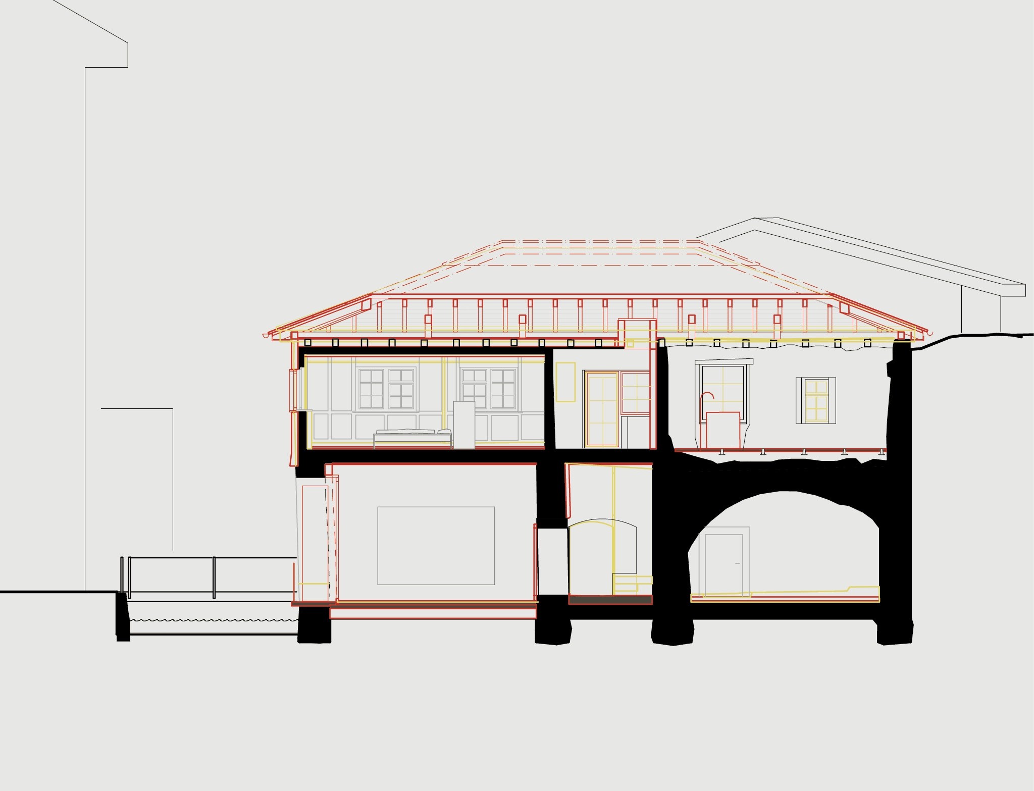 «Zuerst haben wir viel Material entfernt, erst danach geplant», sagt Rossmaier. Stube, Schlafzimmer und Küche waren mit Ständerwändchen verkammert. Hinter dem Täfer und unter den Böden kamen immer weitere Schichten zum Vorschein. Man fand spätgotische Balken mit Ritzungen und Edelholzintarsien. Der Keller war tropfend nass. Im Rückteil des Hauses hingen Betonstellriemen aus den 1960er-Jahren zwischen Stahlträgern. «Ein kalter, russiger Raum, der mir nicht mehr aus dem Kopf ging», erzählt Rossmaier, «vermutlich eine frühere Küche.»