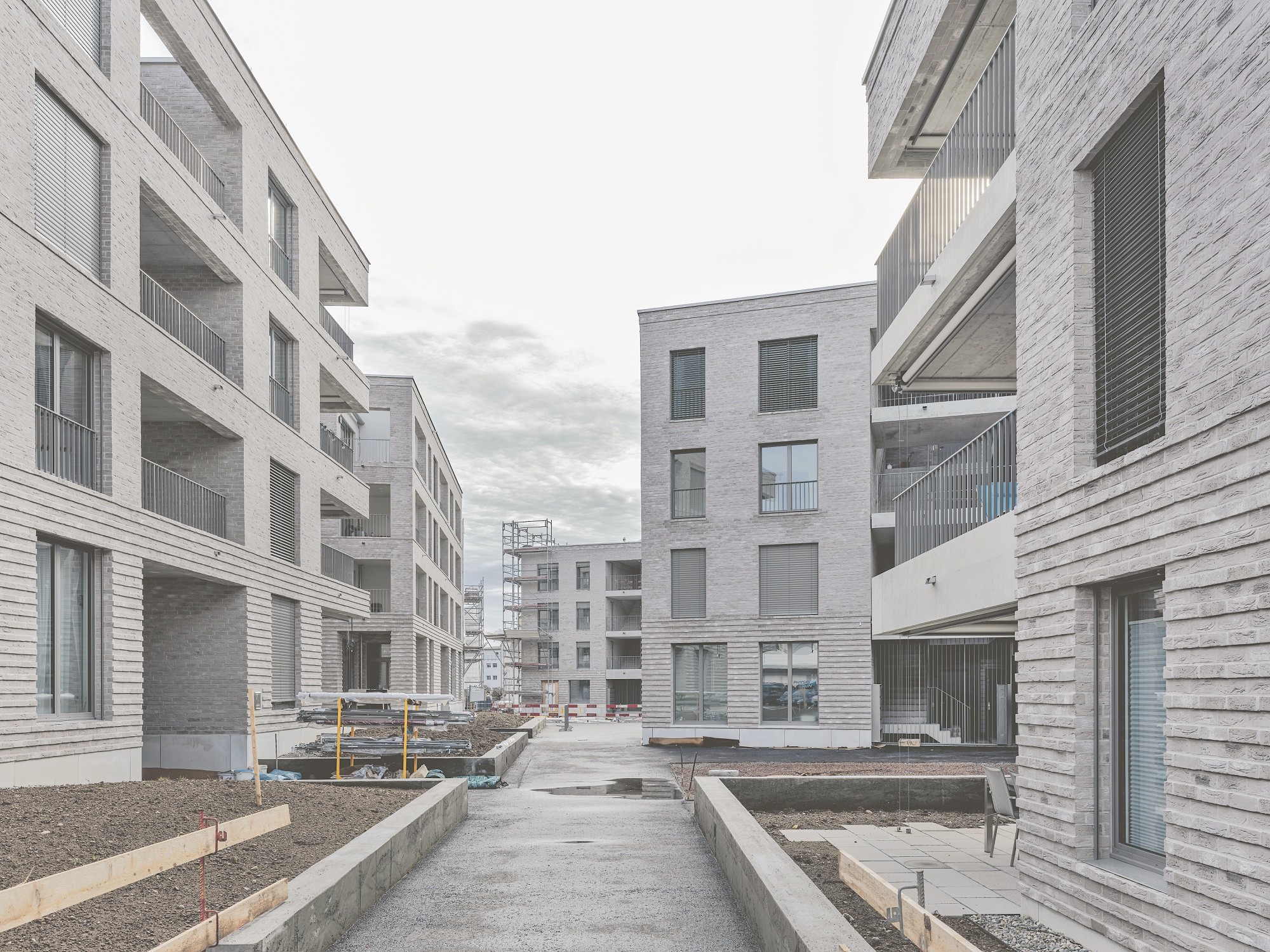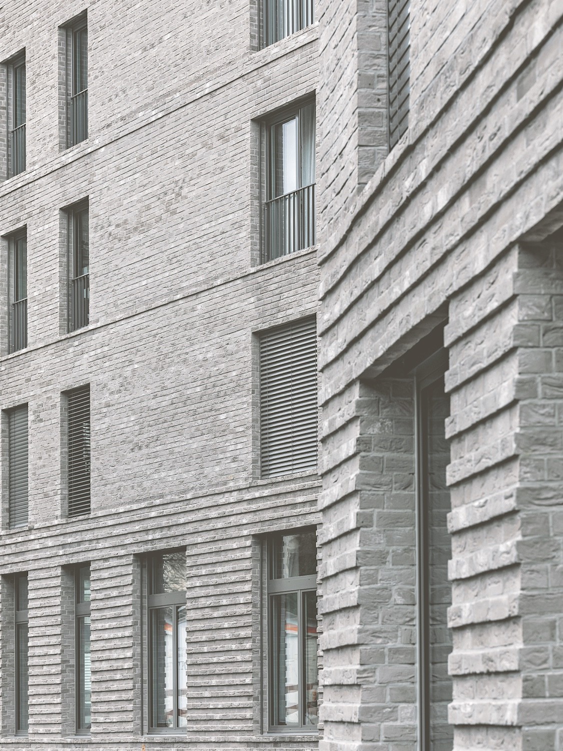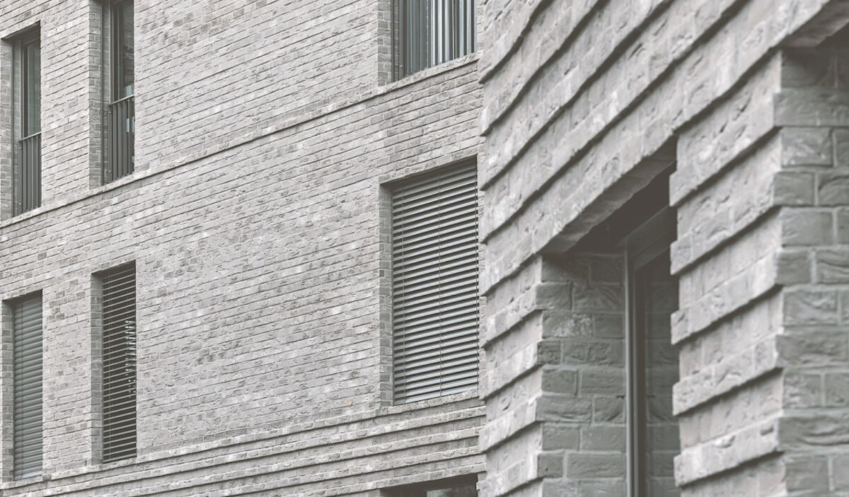Die Fassaden bestehen aus den Klinkerriemchen ‹WDF Akita› und ‹Rega› von Vandersanden. Das Material erinnert an frühere Industrie- und Gewerbebauten und wird in der Schweiz von AGZ Ziegeleien vertrieben. Es eignet sich gut, um den Fassaden aus planen Wänden mit grossen Fensteröffnungen mehr plastische Tiefe zu verleihen. Ausserdem fasst die Materialisierung die unterschiedlichen Kubaturen der Gebäude zusammen. «Das Material ist hochwertig, identitätsstiftend und auch ein Bekenntnis des Bauträgers, sich für den Ort und die Bewohner einzusetzen», sagt die am Projekt beteiligte Architektin Tina Gernet. Klinker, Sicht- und Stampfbeton sowie Metall prägen den Hochbau der Siedlung. Gesucht war eine ruhige, zurückhaltende und im Detail präzise Wirkung. Der Klinker ist auf den Fassadenflächen im wilden Verband verlegt. Bei den teilweise überhohen Erdgeschossen, manchmal auch zwischen weiteren Geschossen, betonen abwechselnd hervorstehende Steinlagen aus 36 statt 20 Millimeter dicken Riemchen die Fassaden. Zum Erdreich hin weisen die Gebäude einen sichtbaren Betonsockel auf.