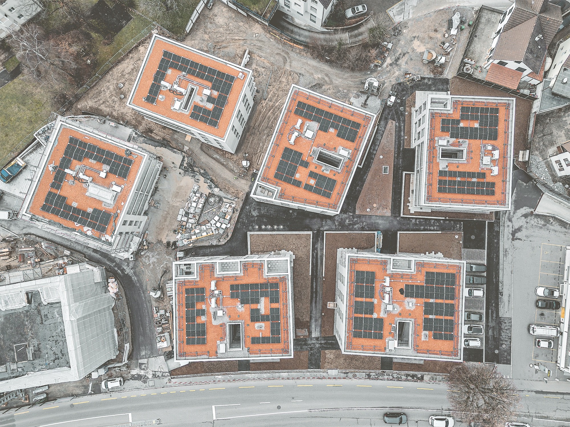 Die Gebäude unterscheiden sich in Volumen und Ausrichtung. Sie befinden sich entlang der Hinwilerstrasse hinter dem Volg-Laden beim Strassenkreisel in der Quartiermitte. Zwei der Wohnbauten und das Pflegeheim orientieren sich an der Strasse, dahinter sind die übrigen Bauten frei im Areal angeordnet. Zwischen den Gebäuden entstehen unterschiedliche Räume; baumbestandene Plätze und Gassen verbinden die Gebäude und deren Eingänge. Die Wege öffnen sich hin zu den Nachbargrundstücken. Das Areal soll durchlässig sein. In die Häuser mit Familienwohnungen gelangt man über offene Treppenhäuser, in denen sich Kletterpflanzen emporranken; die Bewohnerinnen und Bewohner begegnen einander auf grosszügigen Erschliessungszonen; zwischen den Häusern laden Wasserspiele, ein Spiel- und ein Pétanque-Platz zu generationenübergreifenden Begegnungen ein. Mäuerchen aus Stampfbeton, auf denen man auch sitzen kann, grenzen Plätze und Wege von den Grünflächen ab.